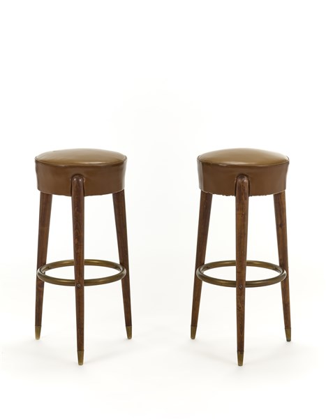 Coppia di sgabelli su disegno. Italia, 1959ca. Gambe troncoconiche in legno, raccordi in metallo, seduta in cuoio. (h cm 79; d cm 36) (difetti)