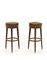 Pair of custom stools. Italy, 1959ca. Conical wooden legs, metal fittings, leather seat. (h 79 cm.; d 36 cm.) (defects)