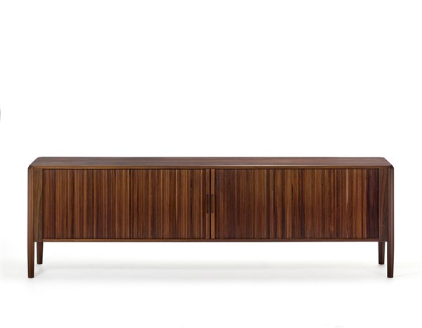 Sideboard con due ante a serranda celanti quattro cassetti e vani a giorno in legno massello e impiallacciato. Italia, anni '60. (cm 242x74x50) (lievi difetti)