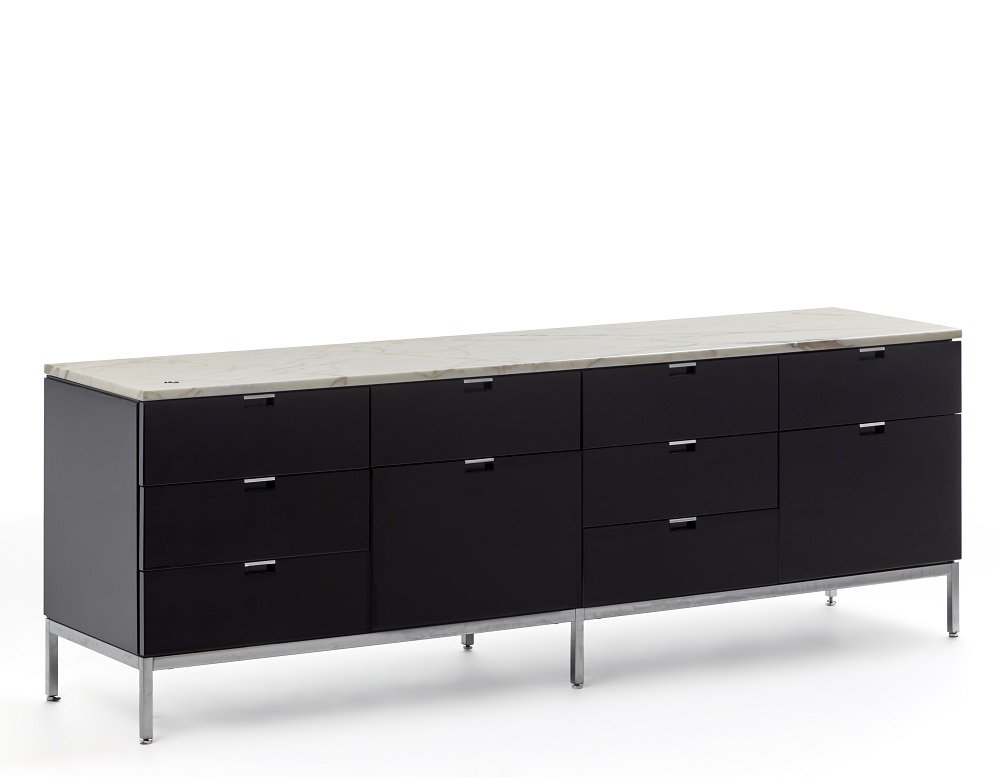 Sideboard a dodici cassetti. Produzione Knoll, anni '90/2000. Struttura in legno impiallacciato e laccato nero, piano in marmo bianco venato e gambe in metallo. (cm 190x65x46)