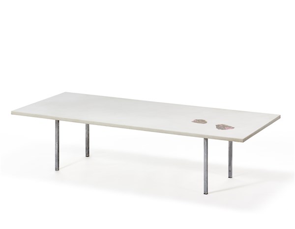 Tavolo da salotto con gambe in profilato di acciaio e piano in marmo bianco con inserti in metallo pietre colorate. Italia, anni '60/'70. (cm 160x37,5x70) (lievi difetti)