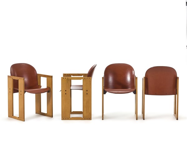 Quattro poltroncine modello "Dialogo". Produzione B&B, Italia, 1974ca. Struttura in legno e seduta in cuoio. (cm 51x80x55) (lievi difetti)