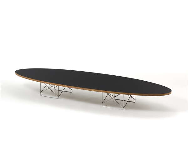 Tavolino da salotto modello "ETR (Elliptical Table Rod Base)". Produzione Herman Miller, USA, anni '50/'60. Piano in multistrato e tondino in acciaio. (cm 224x26x73) (lievi difetti)