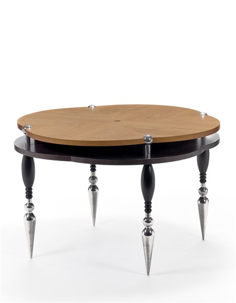 Round table. Produced by Scarabas, Czech Republic, 1995ca. Double top veneered in cherry and black stained maple, legs in chromed metal and wood with spherical and conical ends in aluminum. (h 78 cm.; d 122 cm.) (slight defects)