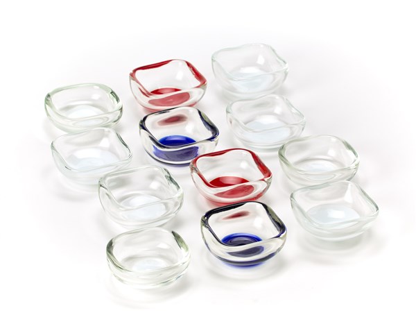 Gruppo di dodici ciotoline. Esecuzione Venini, Murano, anni '80/'90. Vetro soffiato trasparente incolore, lattimo, blu e rosso. Firmate e datate a punta. (cm 9x4,5x9)