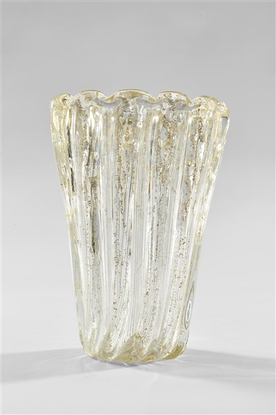 Vaso costolato in vetro soffiato trasparente incolore con inclusioni di foglia d'oro e bolle. Murano, 1950. Firmato a punta "Toso Murano 1950". (h cm 30) (lievi difetti)
