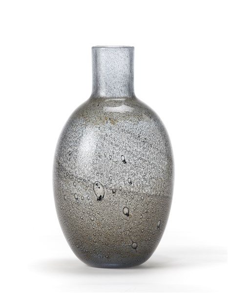 Vaso a bottiglia della serie "Efeso". Esecuzione Barovier & Toso, Murano, 1965ca. Vetro soffiato trasparente grigio antracite con inclusione di bolle e con colorazione a caldo senza fusione. (h cm 27,5)