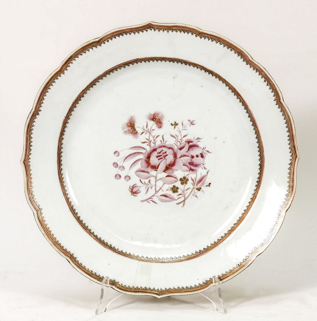 GRANDE PIATTO IN PORCELLANA - LARGE PORCELAIN PLATE Compagnia delle Indie - East India Company bordo sagomato, dipinto con fiori rosa e lumeggiature in oro diam cm 38