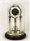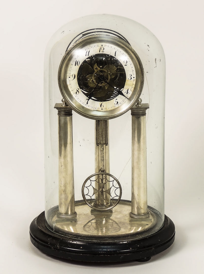 OROLOGIO DA TAVOLO IN METALLO ARGENTATO - SILVER-PLATED TABLE CLOCK XIX secolo - 19th Century quadrante con numeri arabi e meccanismo a vista, su tre colonne di sostegno poggianti su base in legno ebanizzato, entro campana di vetro h cm 38