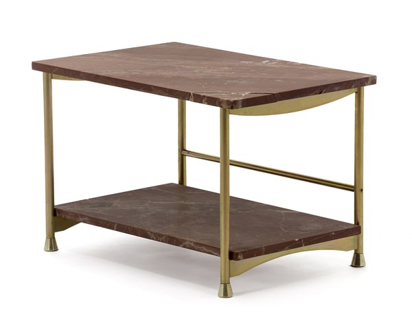 Tavolino da salotto su disegno. Torino, Anni '70/'80. Montanti e traverse in tubolare e piattina metallica ottonata, due ripiani in marmo rosso. (cm 70x45x45) (difetti)