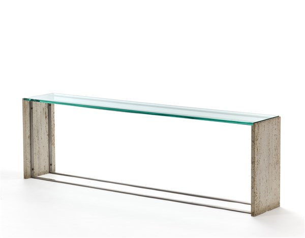 Grande consolle. Torino, 1972. Montanti in lastra di travertino, traverse in acciaio inox, piano in cristallo molato di forte spessore