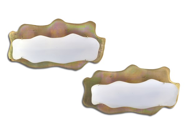Coppia di grandi lampade da parete su disegno. Torino, Anni '70/'80 Struttura in metallo ottonato, schermo diffusore in vetro incamiciato lattimo.