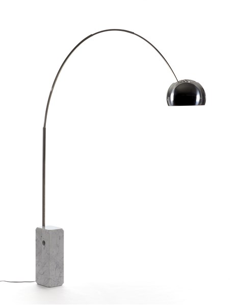 Lampada da terra modello "Arco". Produzione Flos, Milano, 1962. Base parrallelepipeda in marmo bianco, stelo curvato a tre settori in acciaio e paralume in acciaio e alluminio forato. (cm 210x240)(lievi difetti)