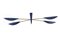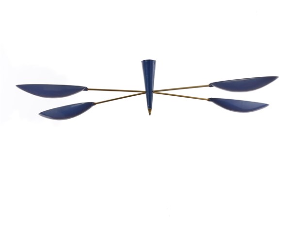 Lampada a sospensione a quattro luci. Italia, anni '50. Diffusori in alluminio laccato blu. (cm 129x25x66) (lievi difetti)
