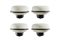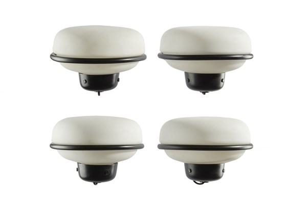 Gruppo di quattro lampade da parete modello "228/e". Produzione Arteluce, Milano, 1957. Diffusori in vetro satinato, coppetta portalampadina e anello in alluminio verniciato nero. (d cm 25,5) (difetti)
