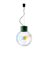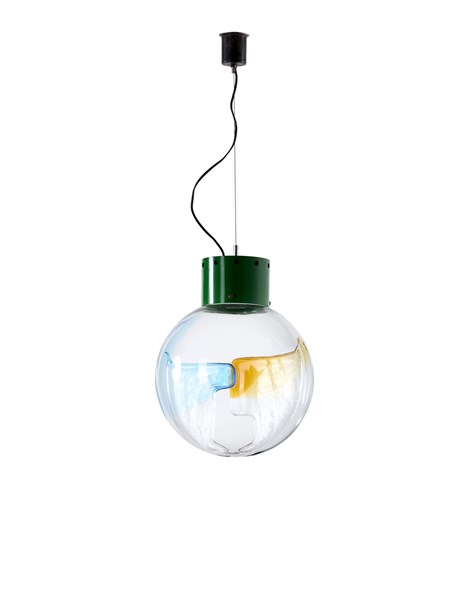 Suspension lamp of the series "Membrane". Produced by VeArt, Murano, 1970s. Crystal blown glass, orange and light blue, and green lacquered metal. (d 32 cm.) (slight defects)