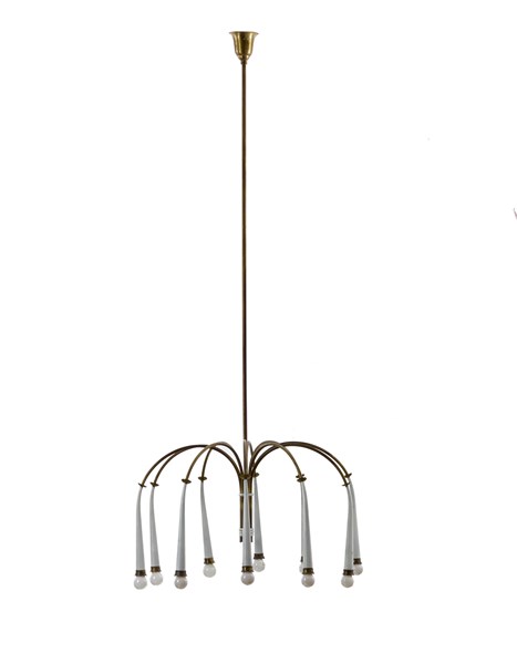 Brass suspension lamp with ten arms with white painted truncated conical terminals and decorated with a brass flower.. (h 166 cm.; d 66 cm.) (slight defects)