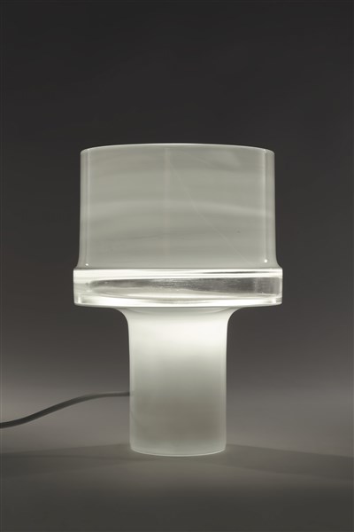 Lampada da tavolo modello "Nebulosa 823.01". Esecuzione Venini, Murano, 1972. Vetro soffiato lattimo con inserti in vetro talpa. (h cm 31; d cm 20,5) (lievi difetti)