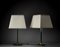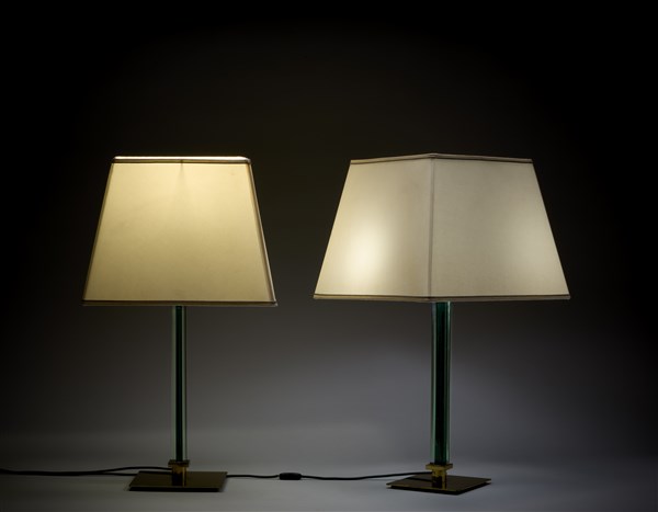 Coppia di lampade da tavolo. Murano, 1986. Vetro verde e trasparente, ottone. Firmate a punta "Venini Italia 86". (h cm 63) (lievi difetti)