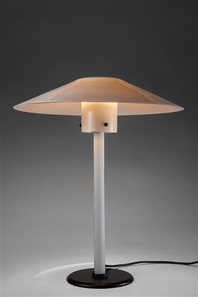 Lampada da tavolo modello "Chiara". Esecuzione Venini, Murano, 1984. Fusto in vetro soffiato bianco a baguette, paralume in vetro incamiciato lattimo e rosa, base in ghisa. (h cm 57)
