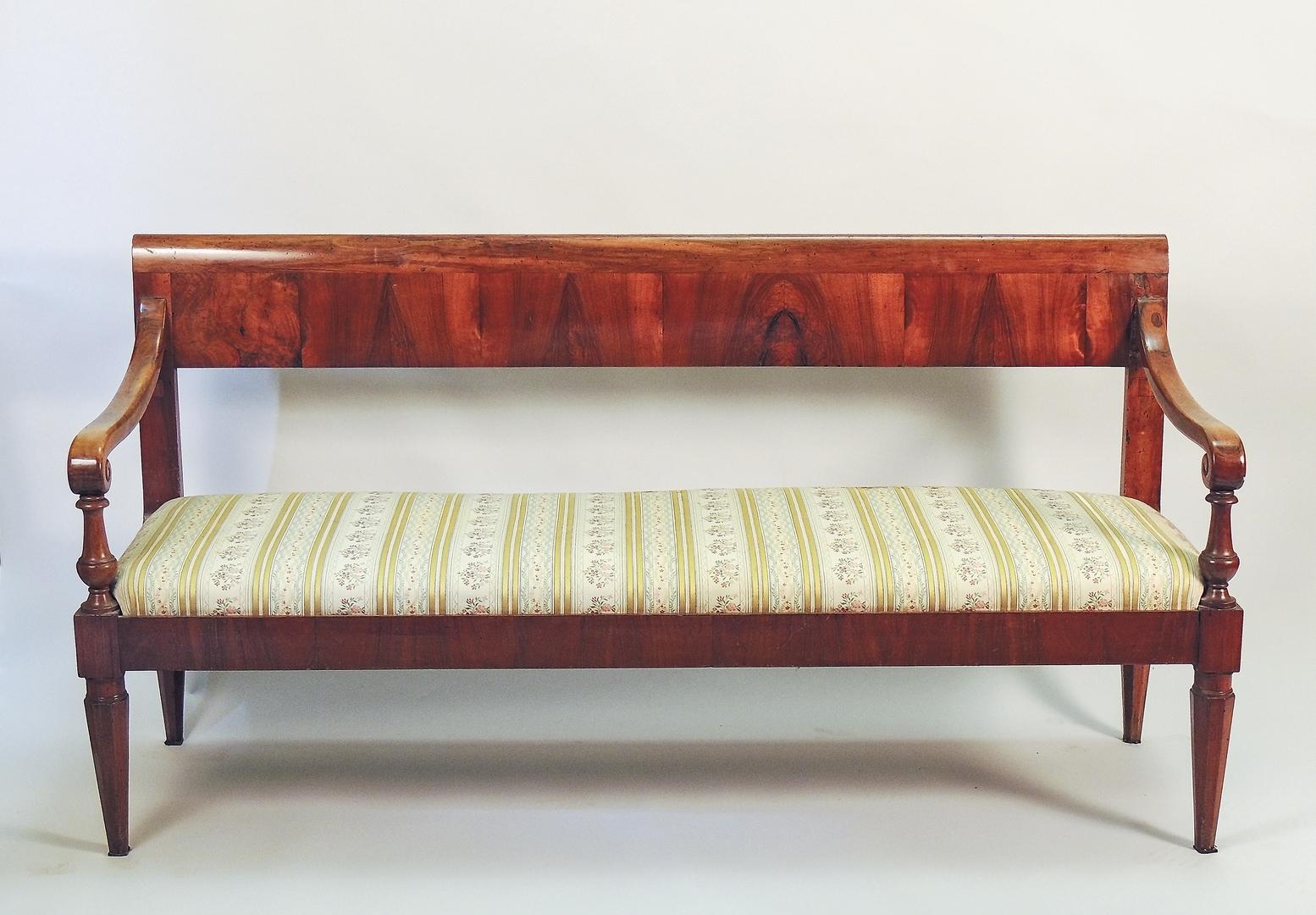 DIVANETTO A PANCA IN CILIEGIO - CHERRYWOOD SOFA/BENCH prima metà del XIX secolo - first half of 19th Century schienale a fascia, braccioli a giorno con finale a ricciolo, gambe a faretra sfaccettate, rivestito in broccato rigato h cm 87x168x53