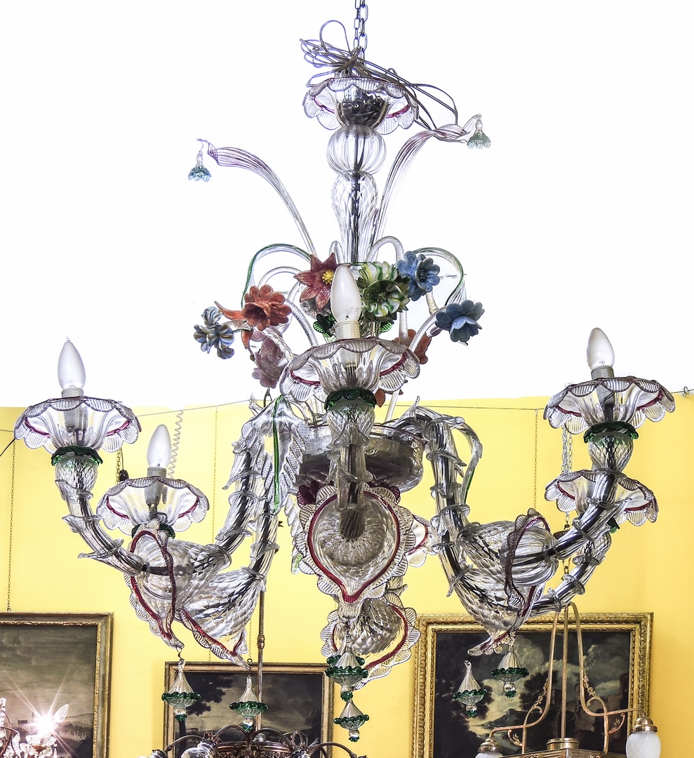 GRANDE LAMPADARIO IN VETRO SOFFIATO INCOLORE - LARGE BLOWN GLASS CHANDELIER Murano, prima metà del XX secolo - Murano, first half of 20th Century otto bracci portacandele a doppia voluta con trionfo di fiori in pasta di vetro nei toni pastello, alcuni difetti