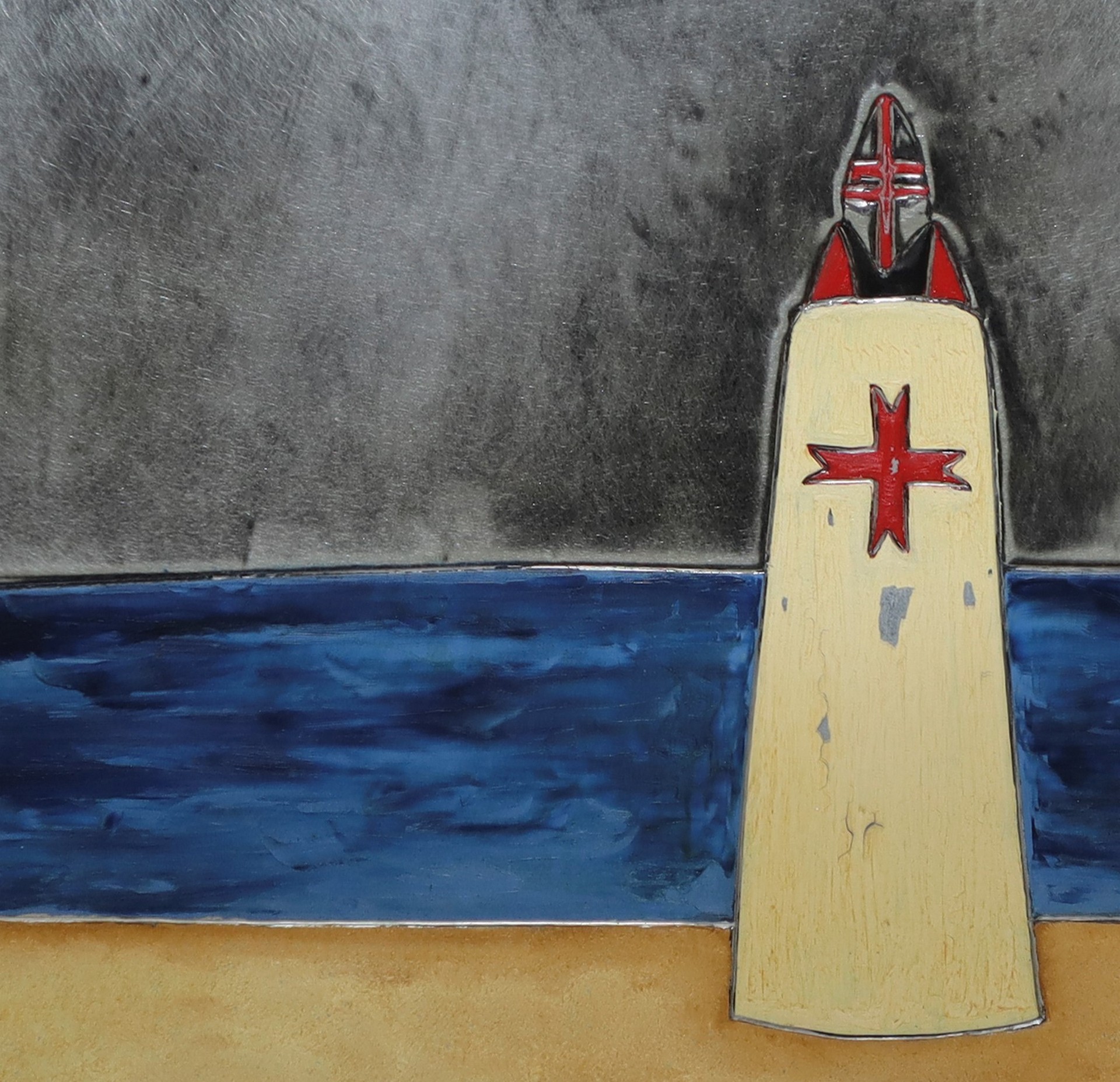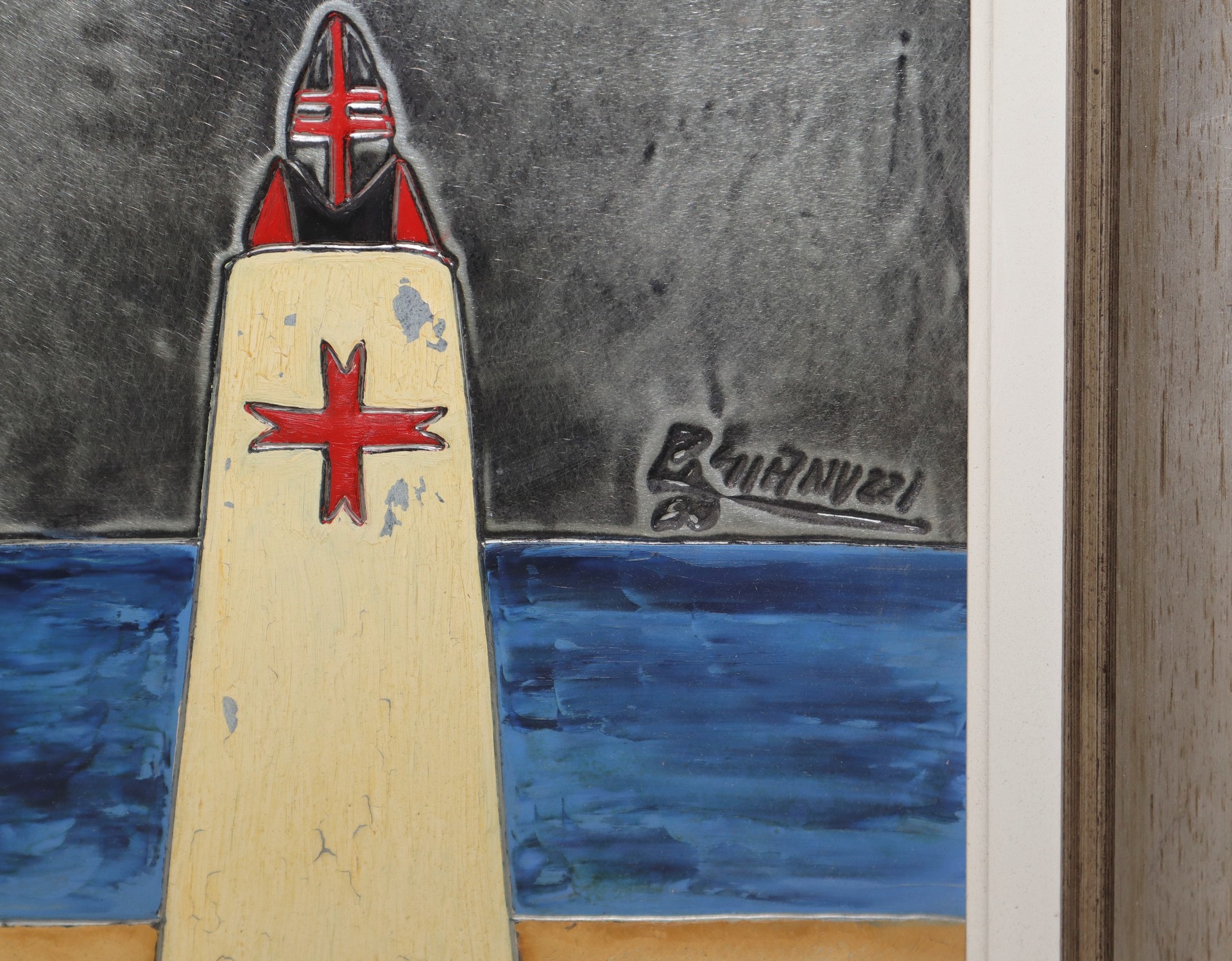Piero Gianuzzi (1937-1996) - Soldati con scudo crociato Cm 51(h) x 69, in cornice cm 71 x 91 Olio su zinco Firmato in basso a destra