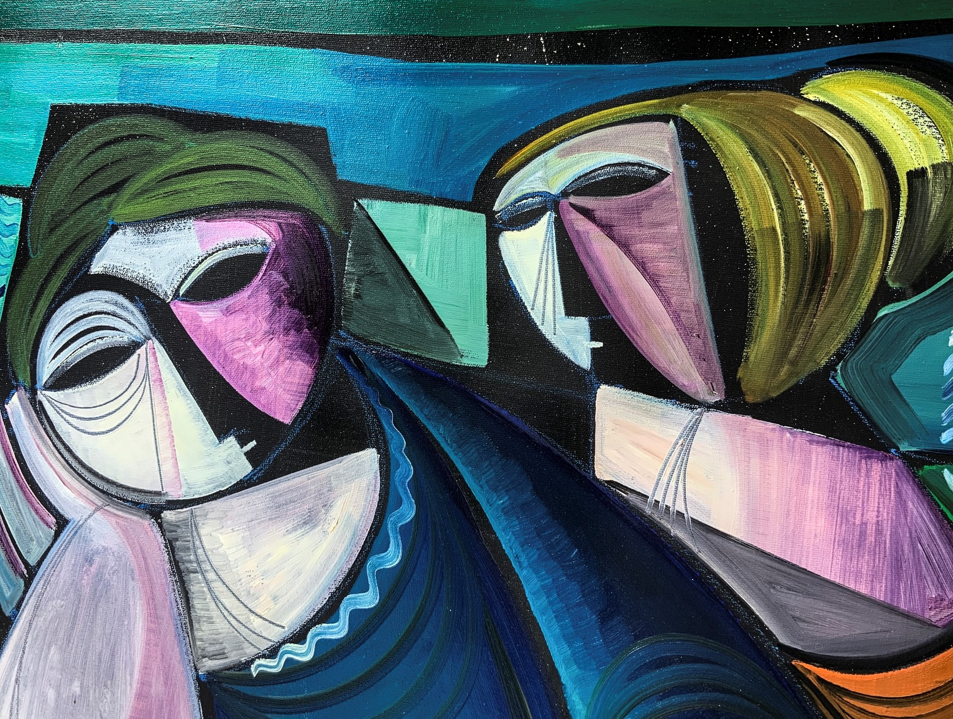 Vittorio Maria Di Carlo (Gargano 1939-Gargano 2015) - Donne cm 70x70, in cornice 92x92 Olio su tela Firmato in basso a destra.