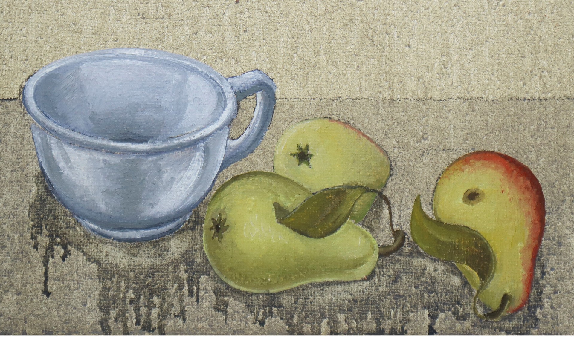 Gioxe De Micheli (Milano 1947) - Le pere e la tazza, 1981 cm 30x40, opera priva di cornice Olio su tela Firmato e datato sul fronte in basso a destra, firmato , titolato e datato al retro