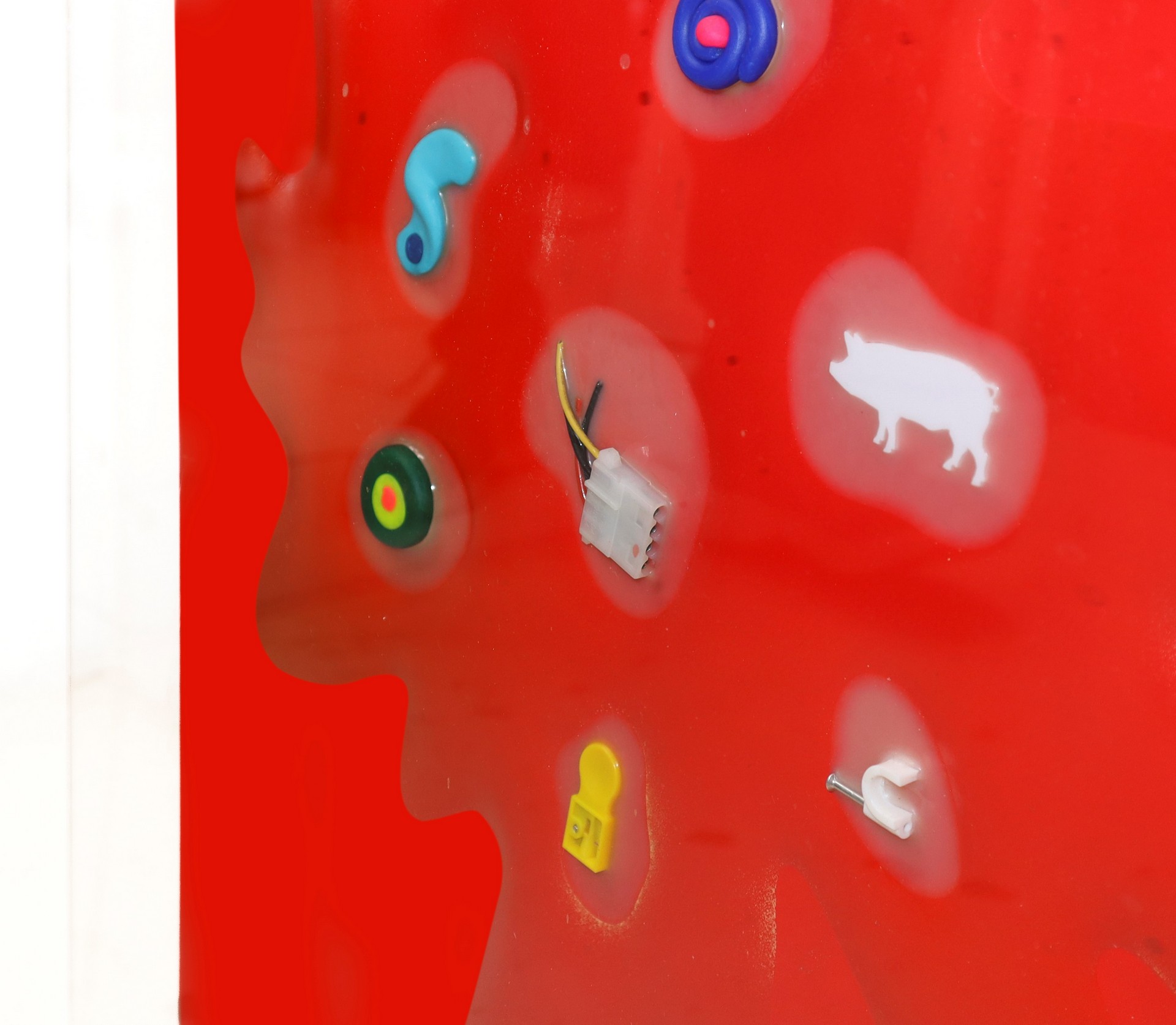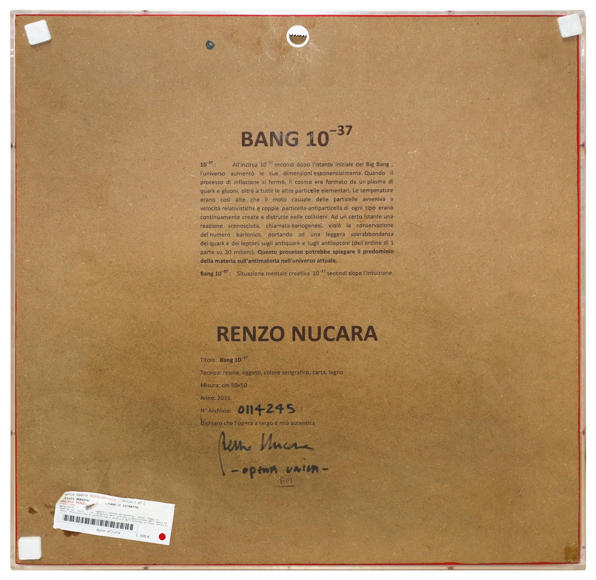 Renzo Nucara (1955) - Bang 10-37, 2011 cm 50 x 50 Tecnica mista su masonite Legno, carta, colore serigrafico, resine, oggetti. Entro teca di plexigrlass. Firma titolo misura e anno al retro. Archivio Nucara su fotografia.