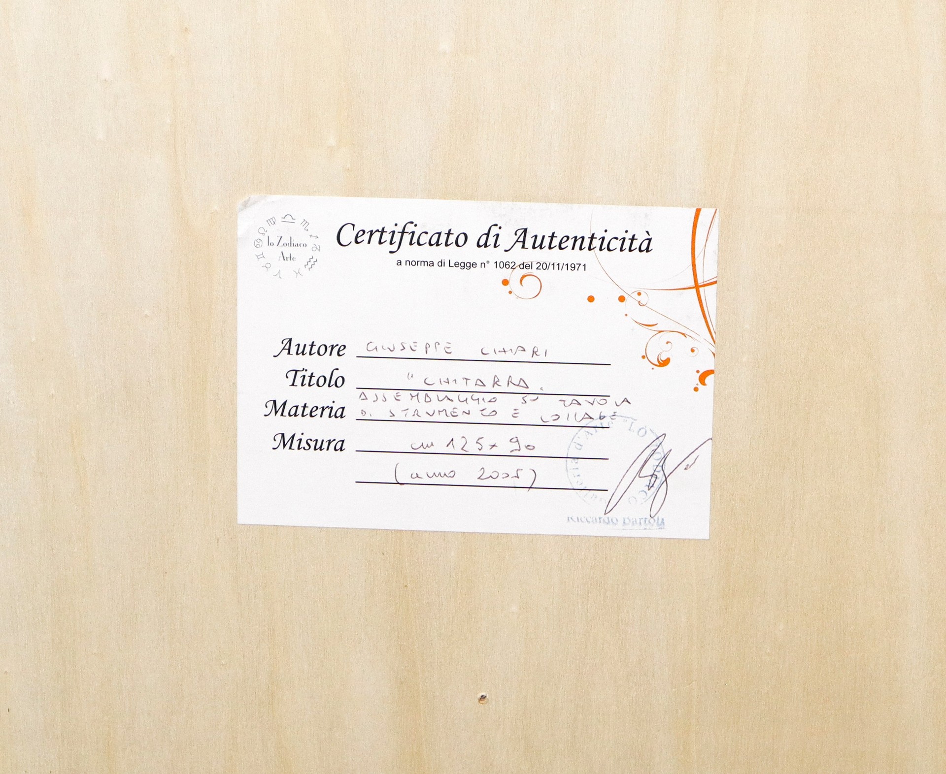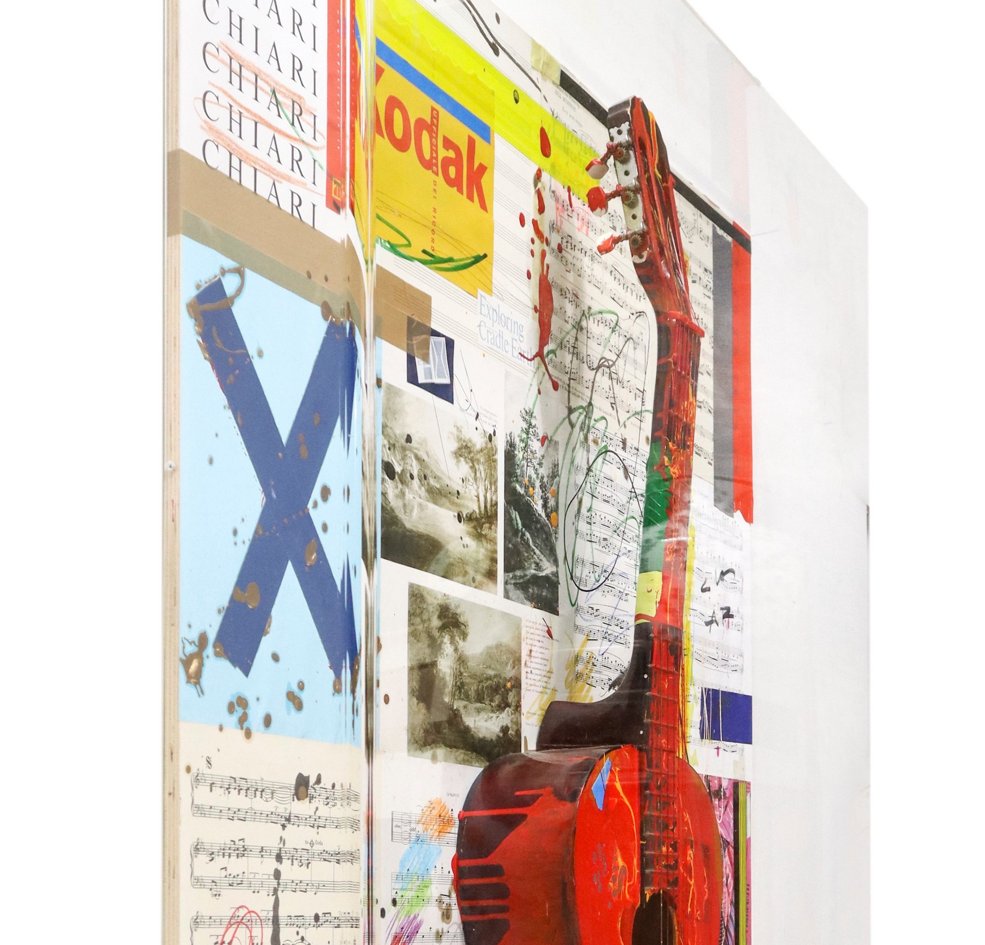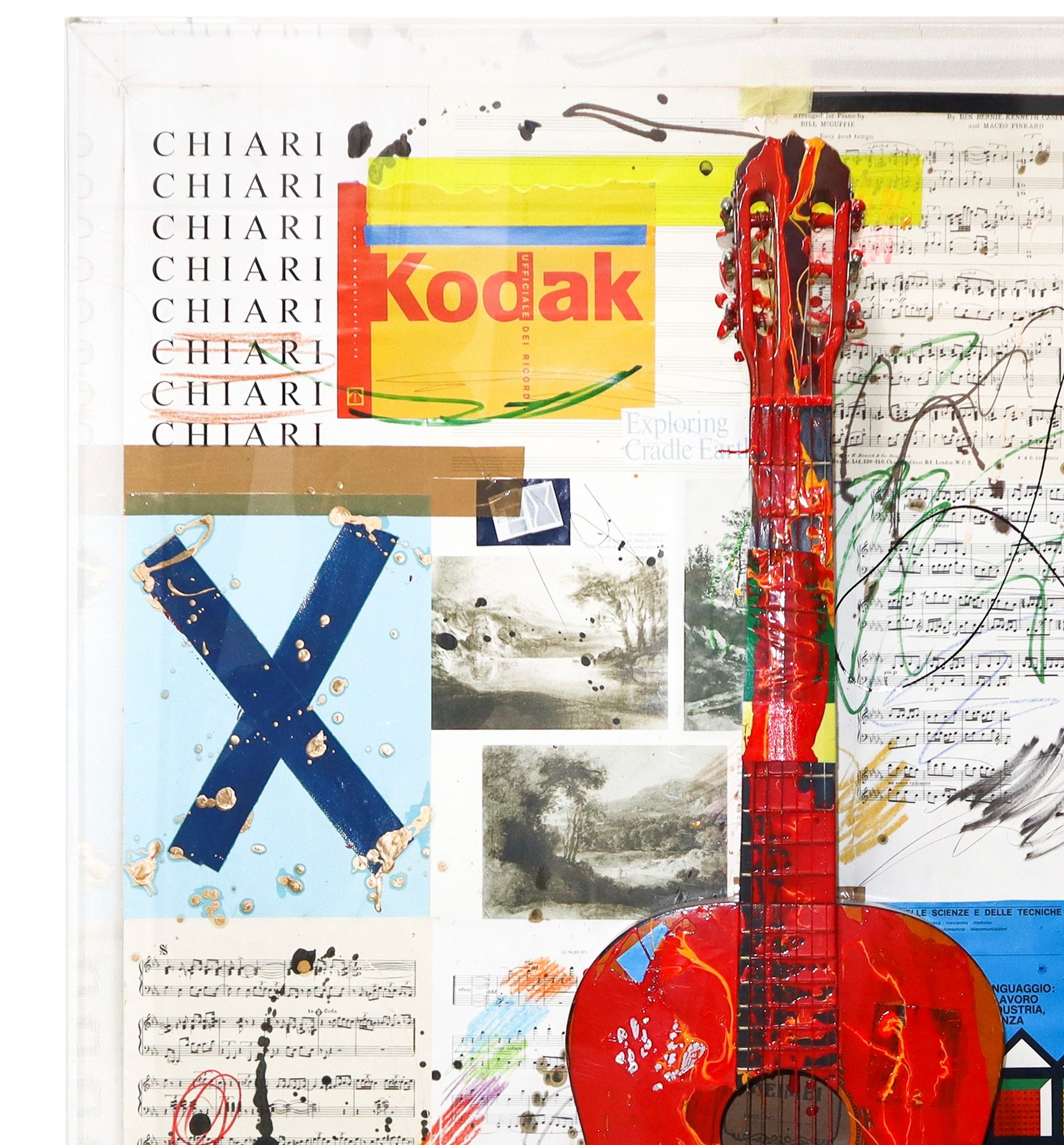 Giuseppe Chiari (1926-2007) - Chitarra, 2005 cm 125 x 90 Asemblaggio su tavola, strumento e collage Sul retro Certificato di autenticita'.