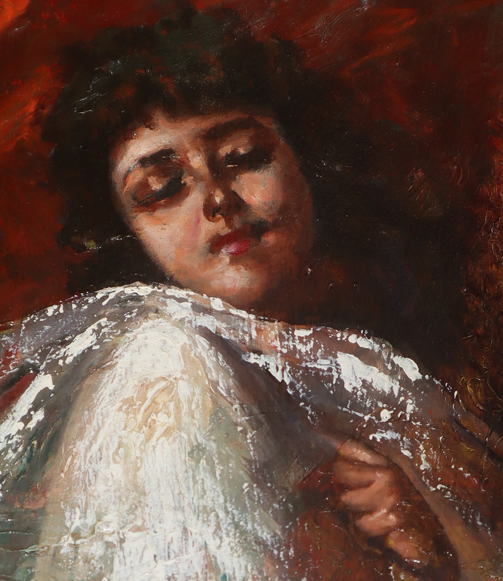Vincenzo Irolli (Napoli 1860-Napoli 1949) - Giovane donna coperta da drappo bianco Cm 38 x 25 Olio su tavola Non firmato. Expertise del Prof. Claudio Strinati