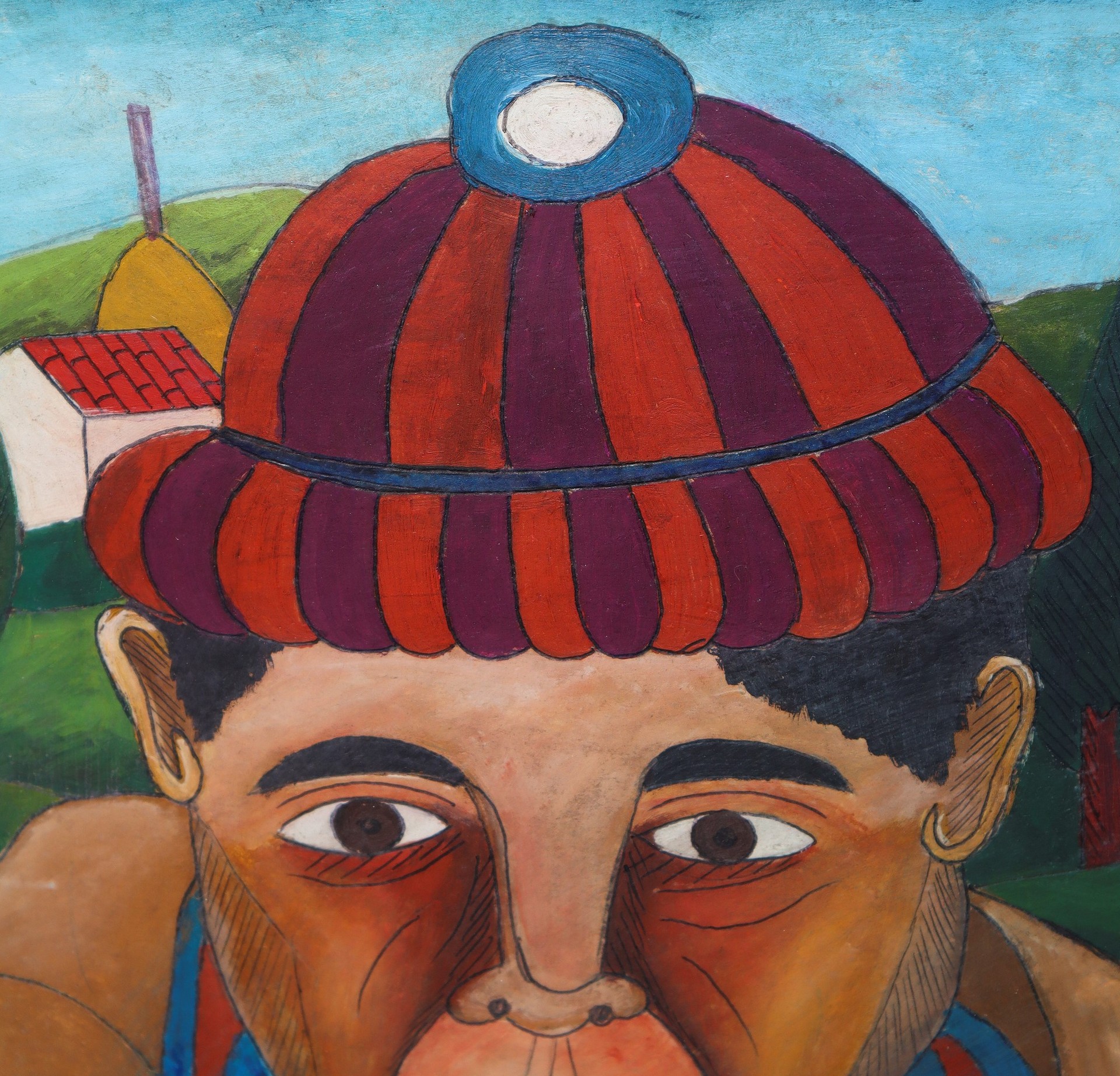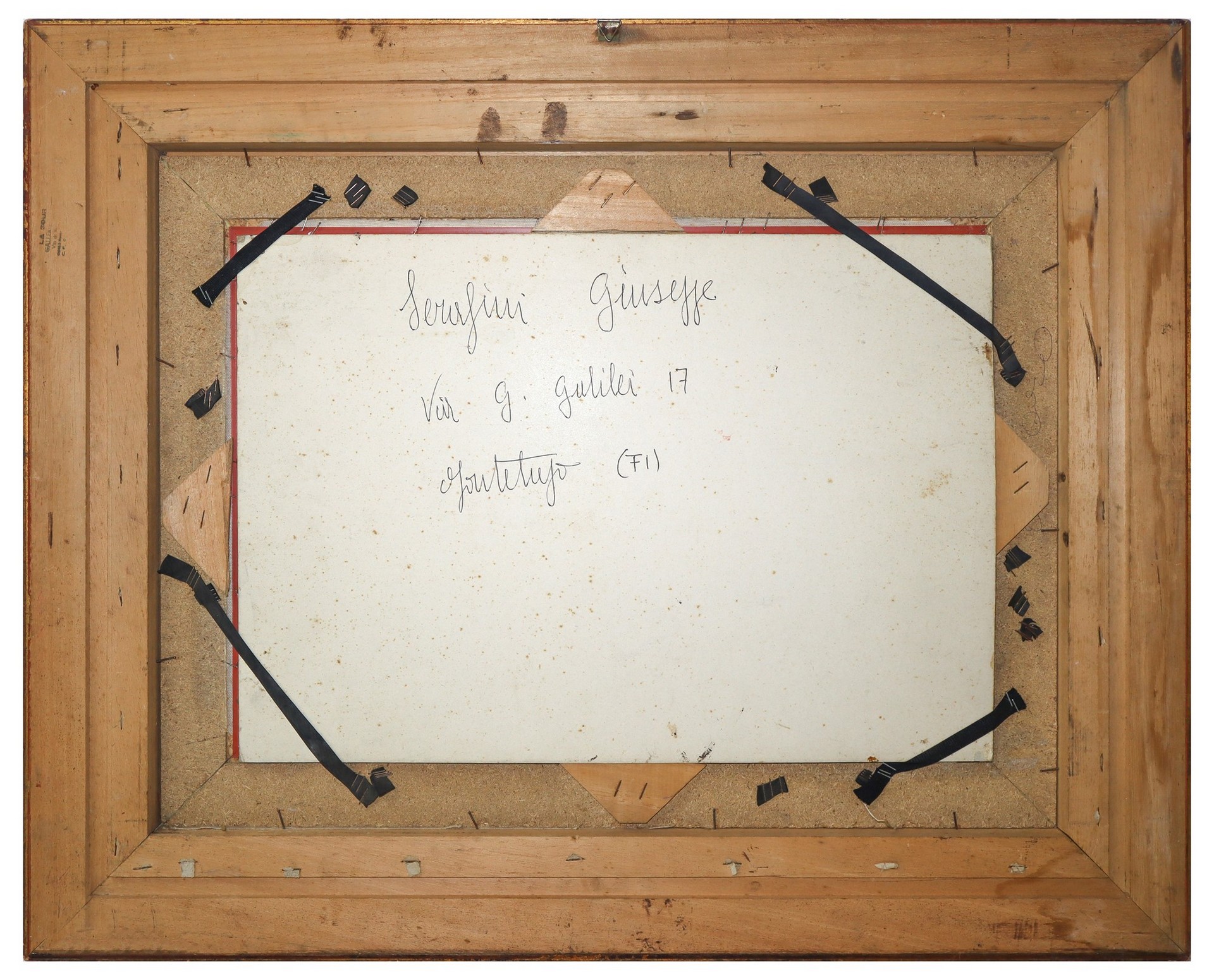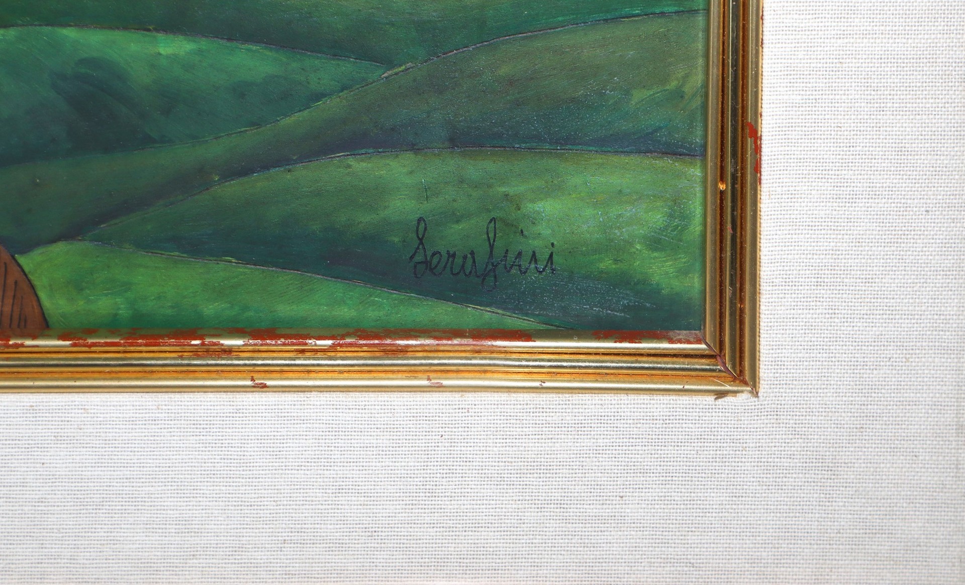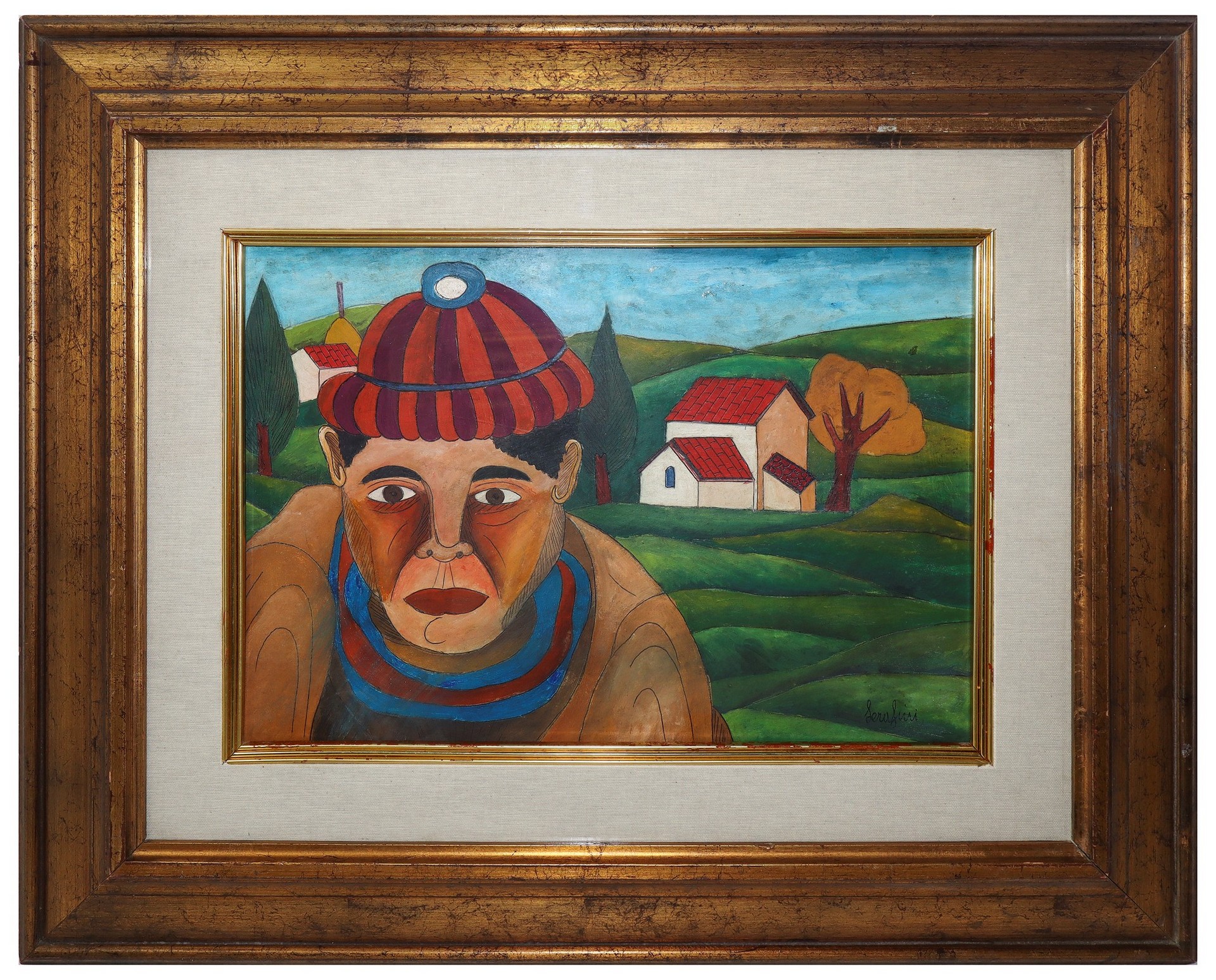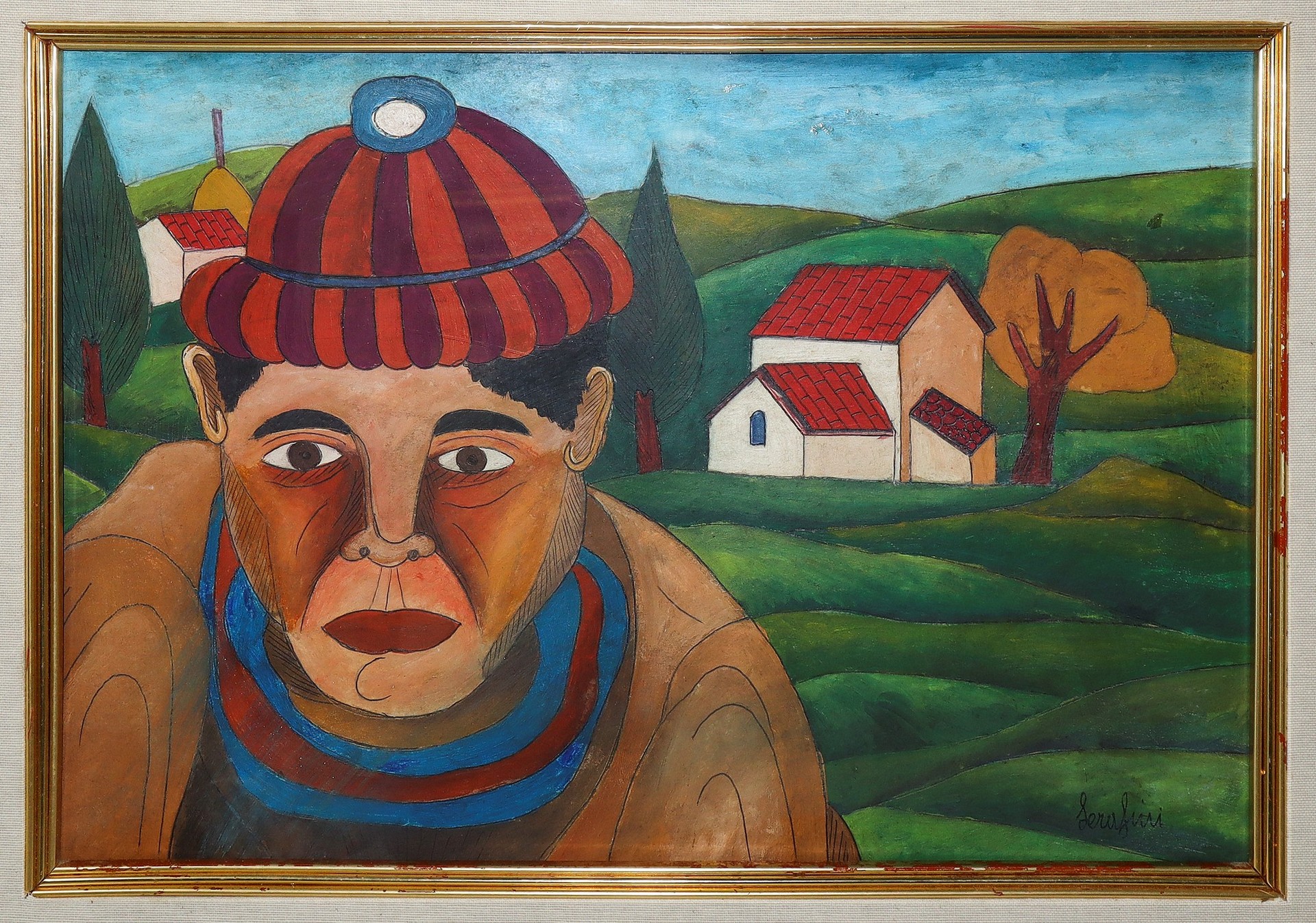 Beppe Serafini (Montelupo Fiorentino 1915-Montelupo Fiorentino 1987) - Uomo e paesaggio cm 35x50, in cornice cm 61x76 Olio su cartone Firmato in basso a destra, firma al retro