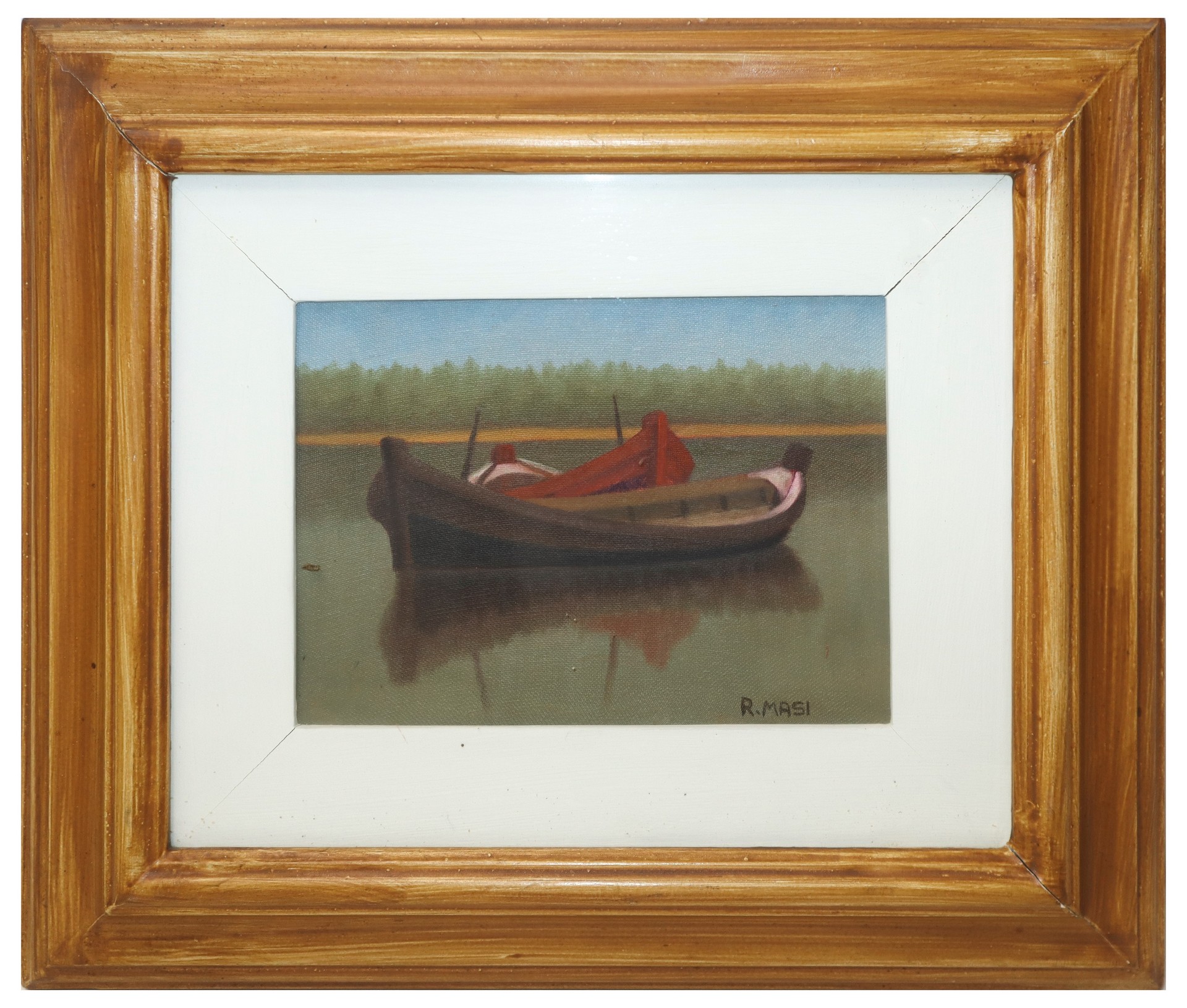 Roberto Masi (Firenze 1940-Firenze 2011) - Barche cm 15x20, in cornice 32 x37 Olio su tela Firmato in basso a destra e sul retro. Certificazione Galleria Renzo Spagnoli Arte (Firenze), N. Arch.12290