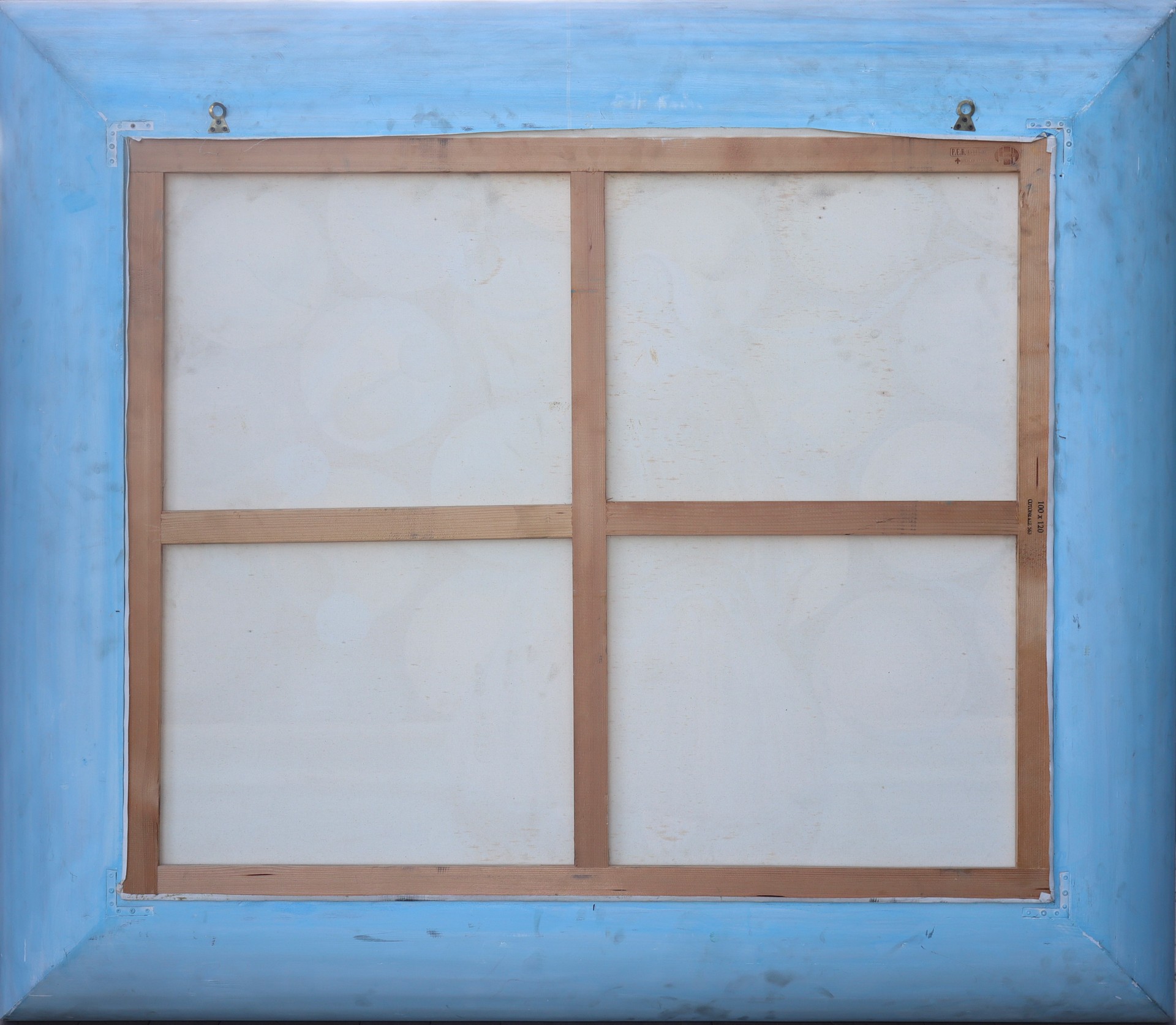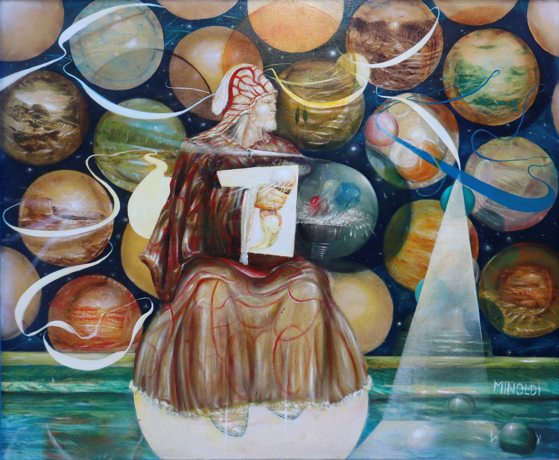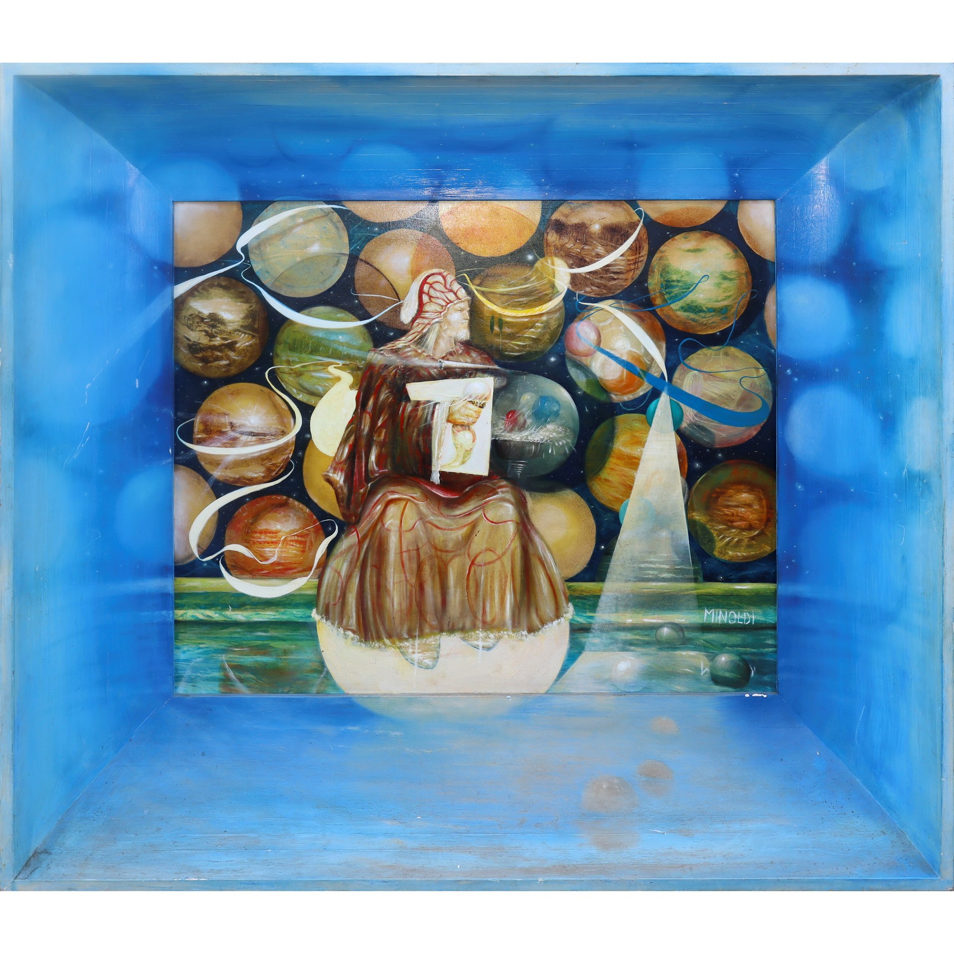 Chris Minoldi (Catania) - Composizione con personaggio e pianeti cm 100x120, in cornice dipinta dall'artista 147x169 Olio su tela Firmato in basso a destra.