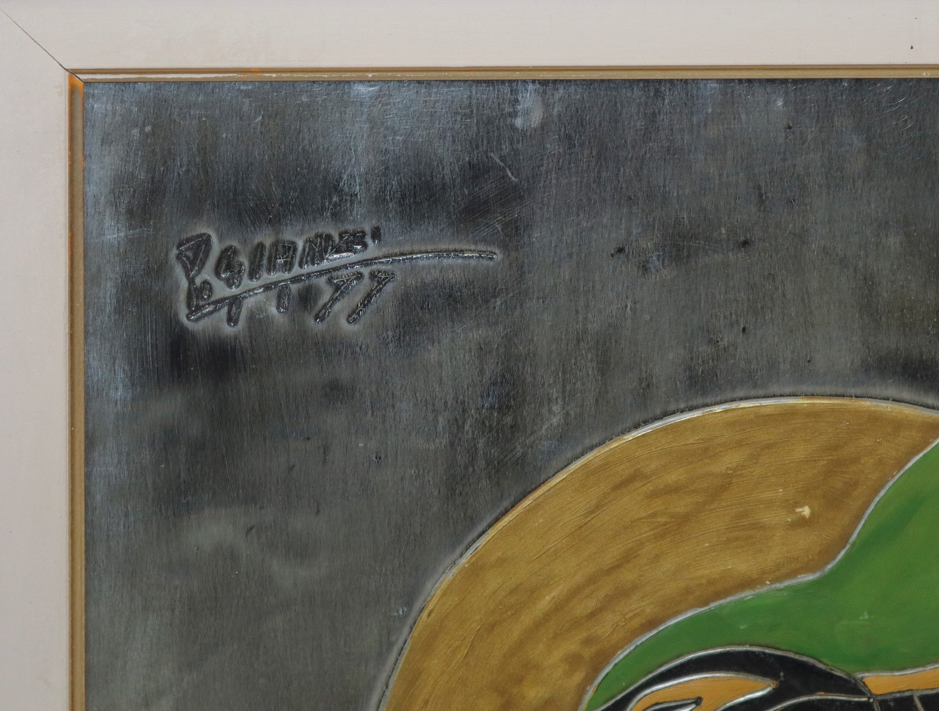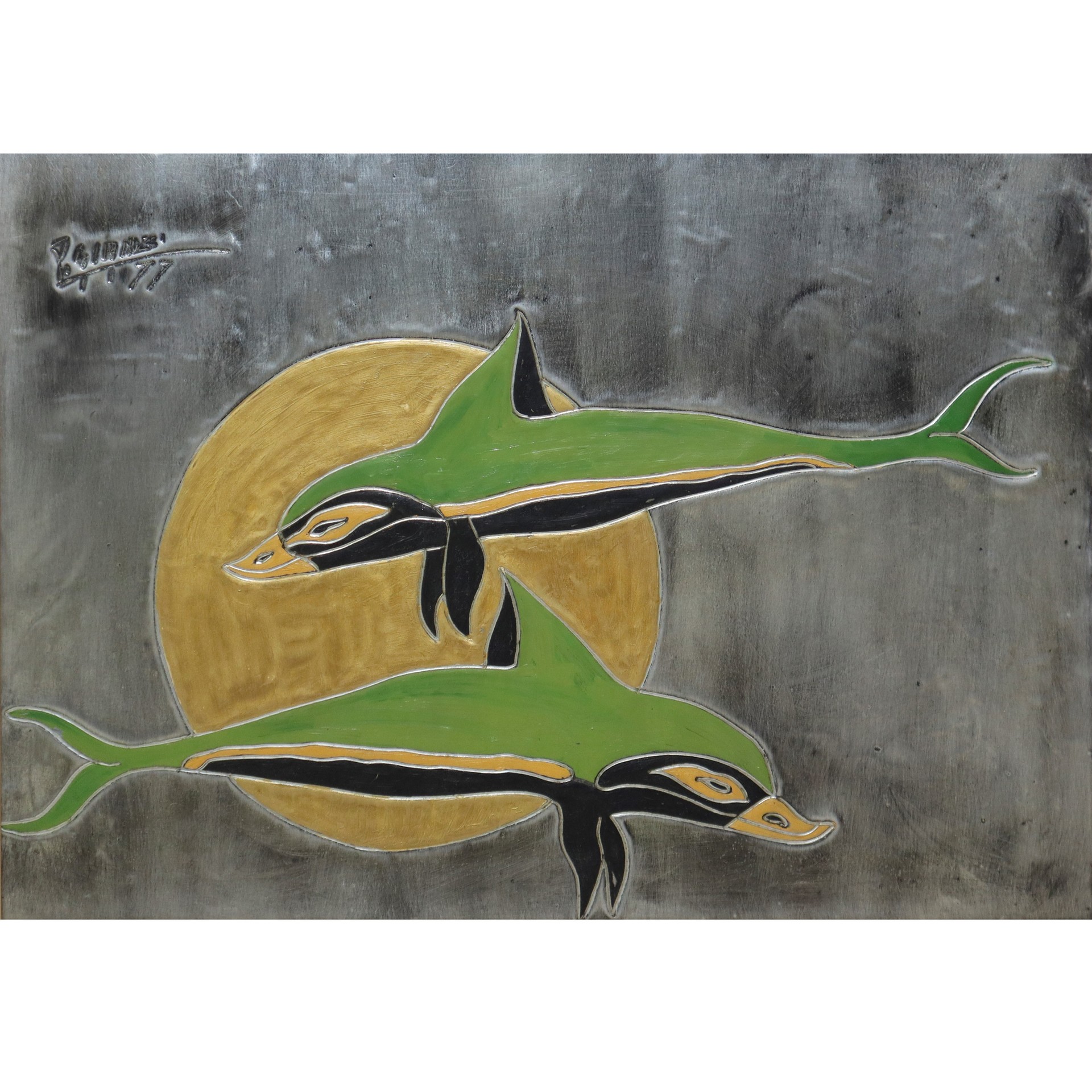 Piero Gianuzzi (1937-1996) - Delfini, '77 Cm 50(h) x 70 in cornice cm 69(h) x 89 Olio su zinco Firmato in alto a sinistra e datato '77