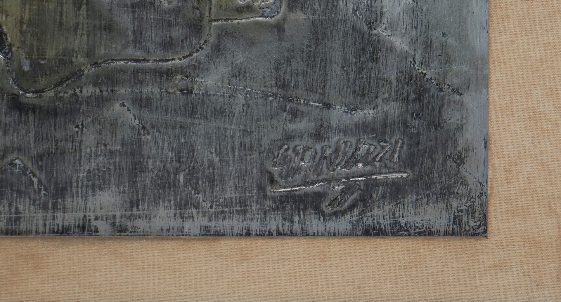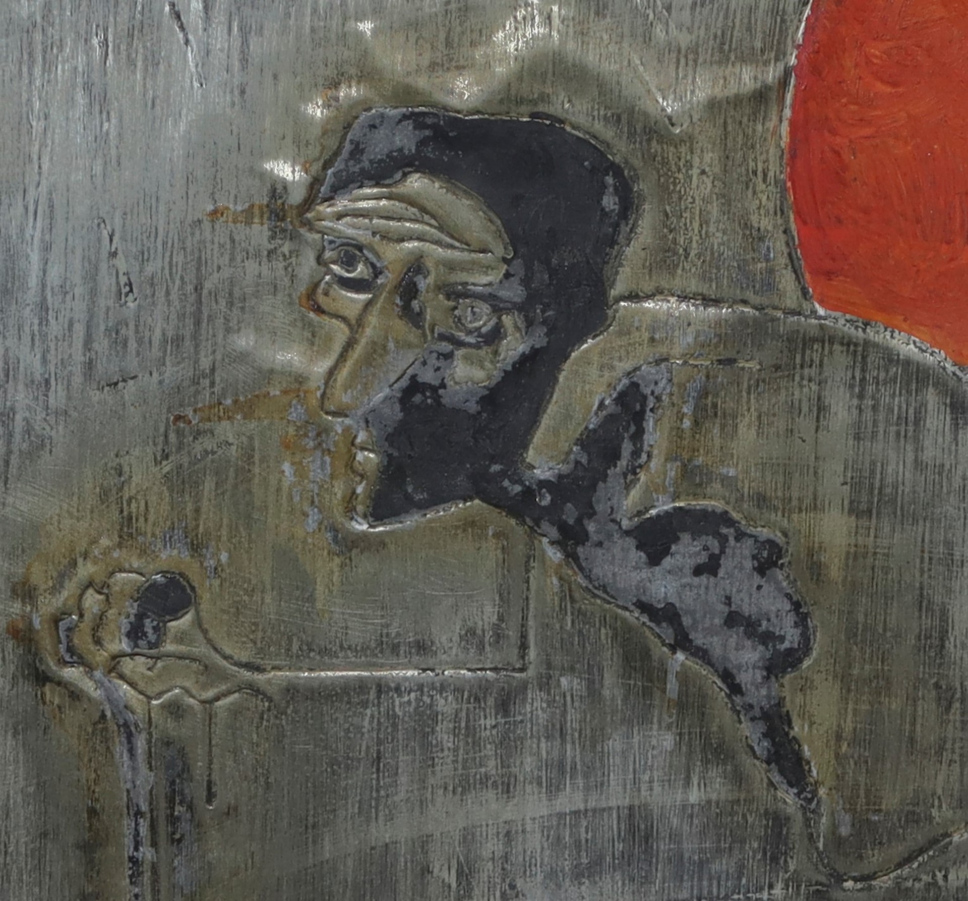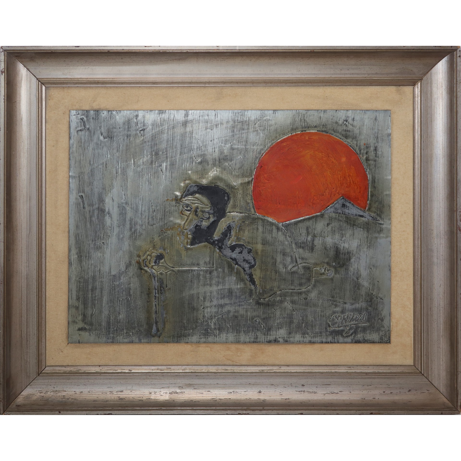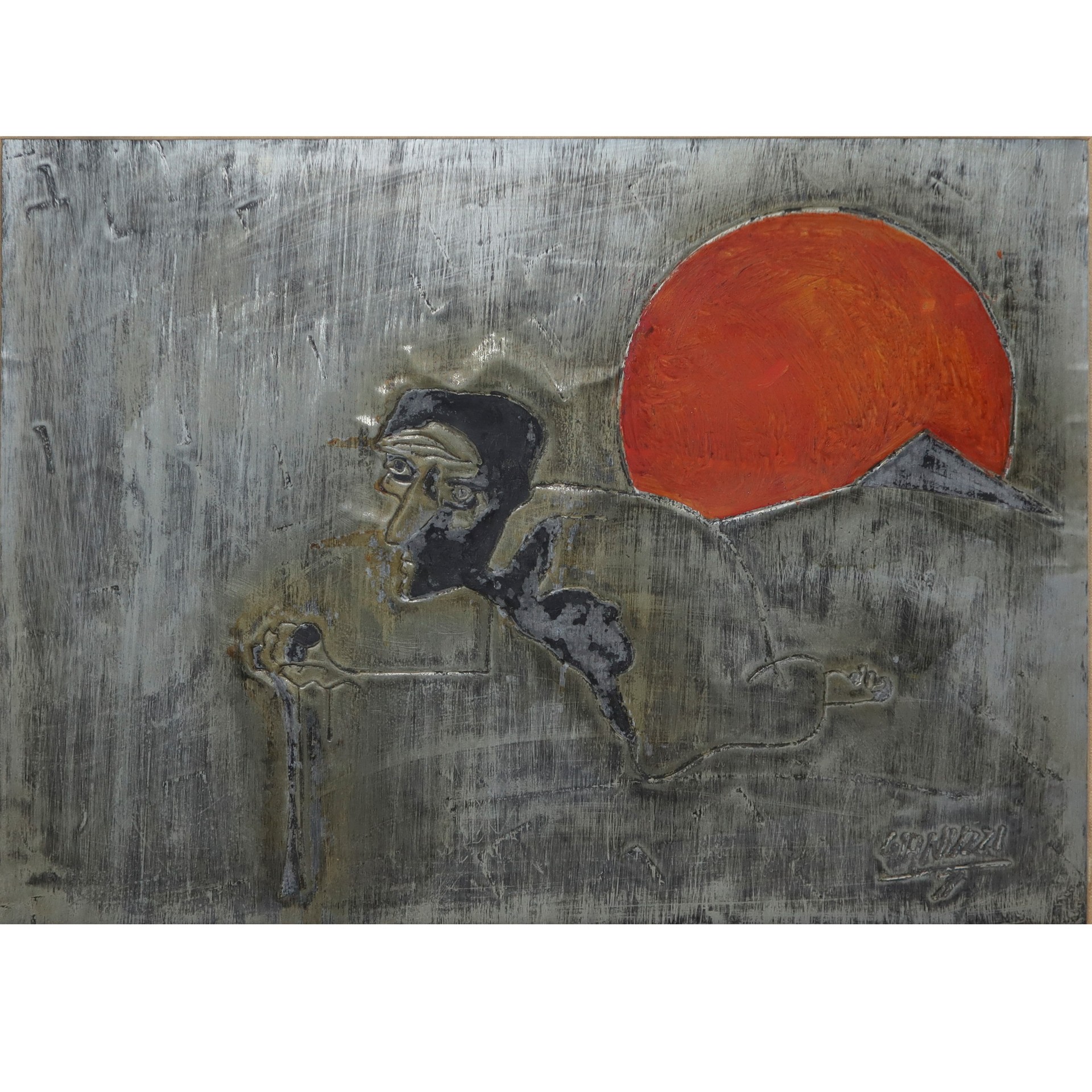 Piero Gianuzzi (1937-1996) - Personaggio e tramonto, 1971 Cm (h) 49 x 66 , in cornice 72 x 89 Olio su zinco Firmato in basso a destra, sul retro etichetta indicante il titolo "La morte del detto" e datato 1971