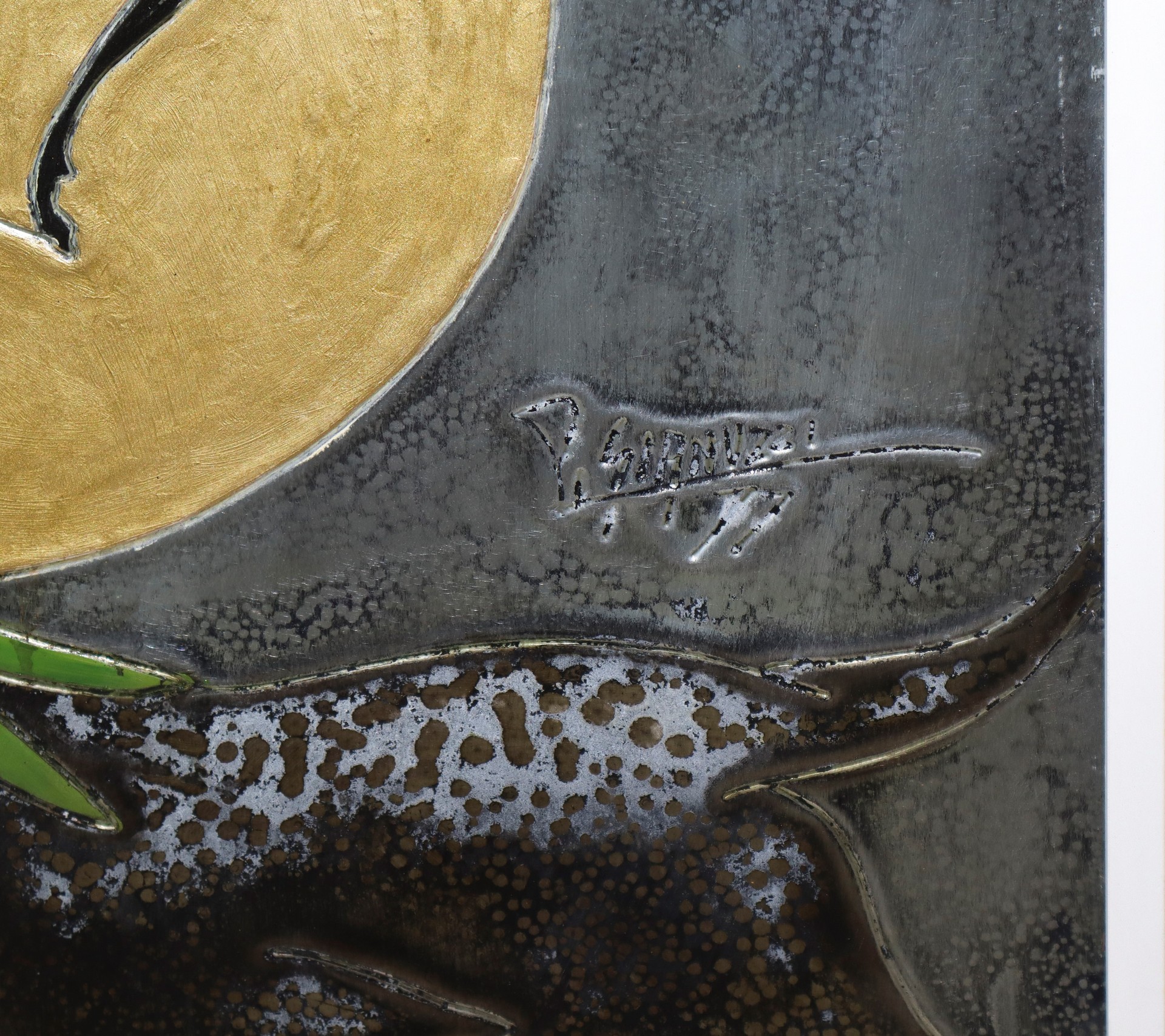 Piero Gianuzzi (1937-1996) - Arciere con corpo da leone, 1977 Cm 71(h) x 50 in cornice cm 89(h) x 69 Olio su zinco Firmato in basso destra, datato 1977