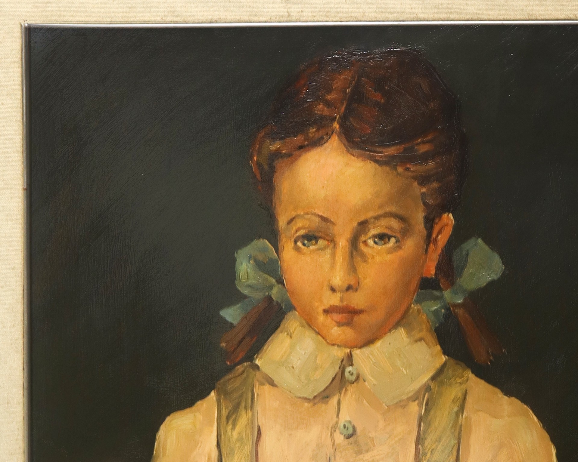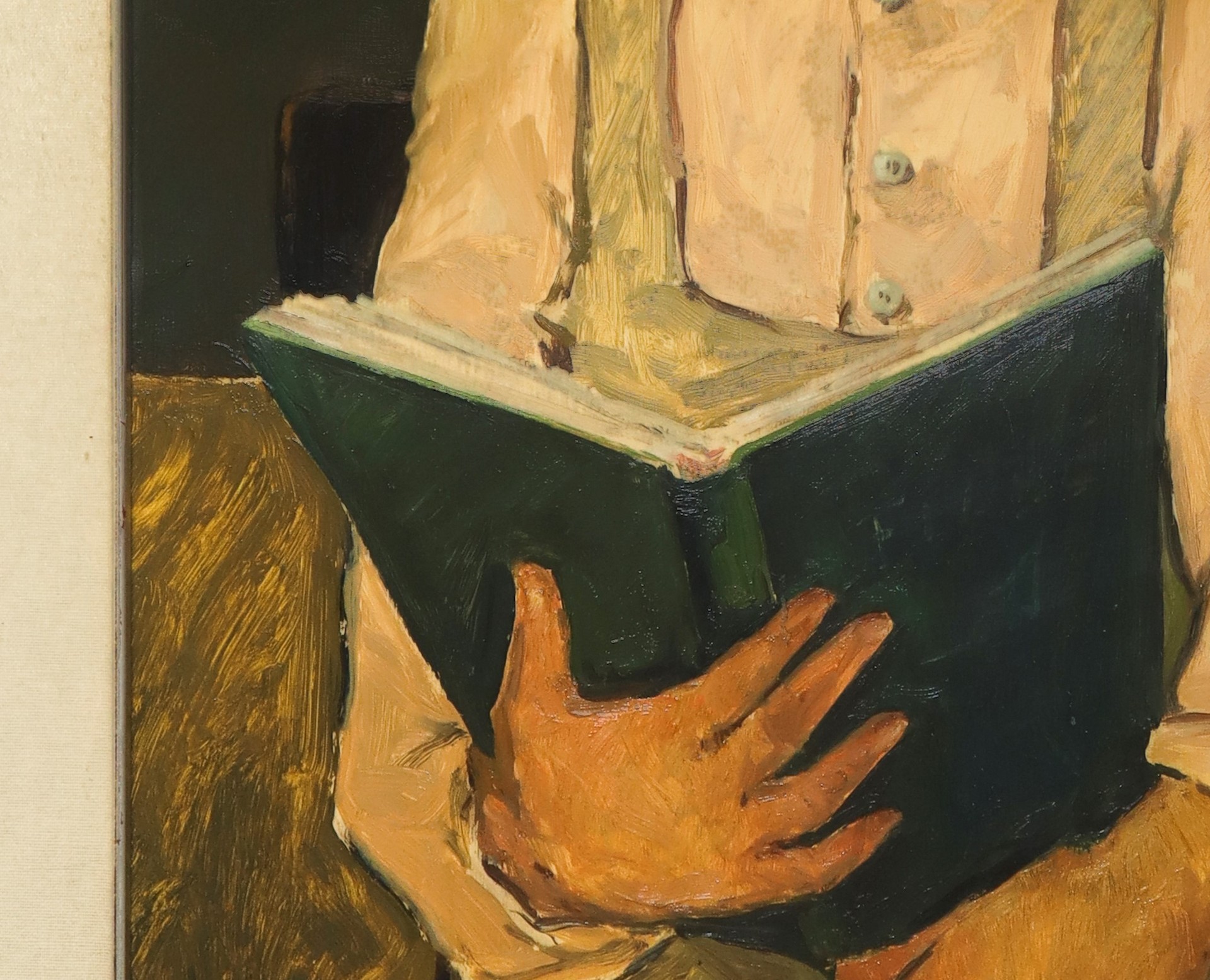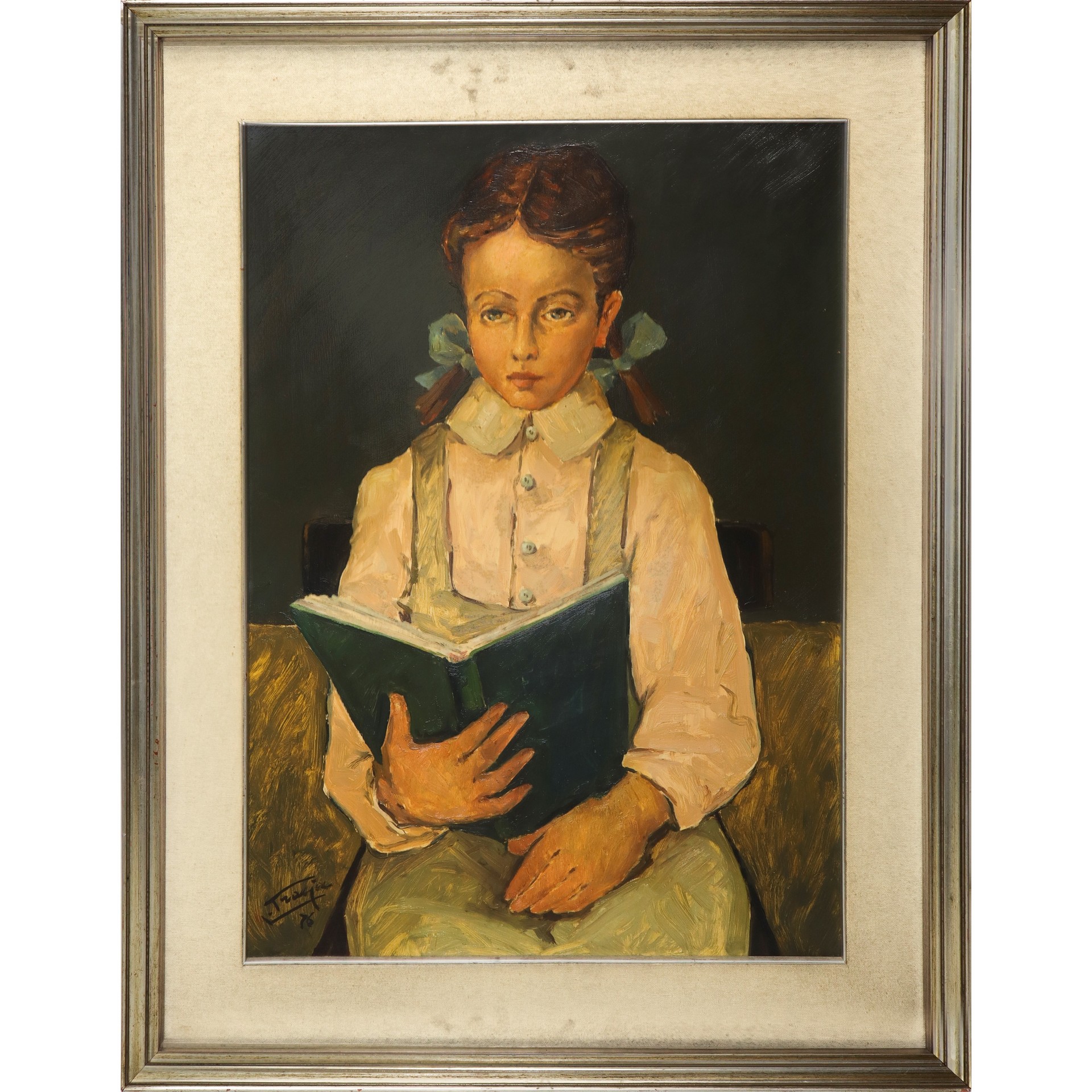 Bambina con libro, 1976 cm 70 x 50, in cornice 87 x 67 Olio su tela Firmato e datato sul fronte in basso a sinistra.