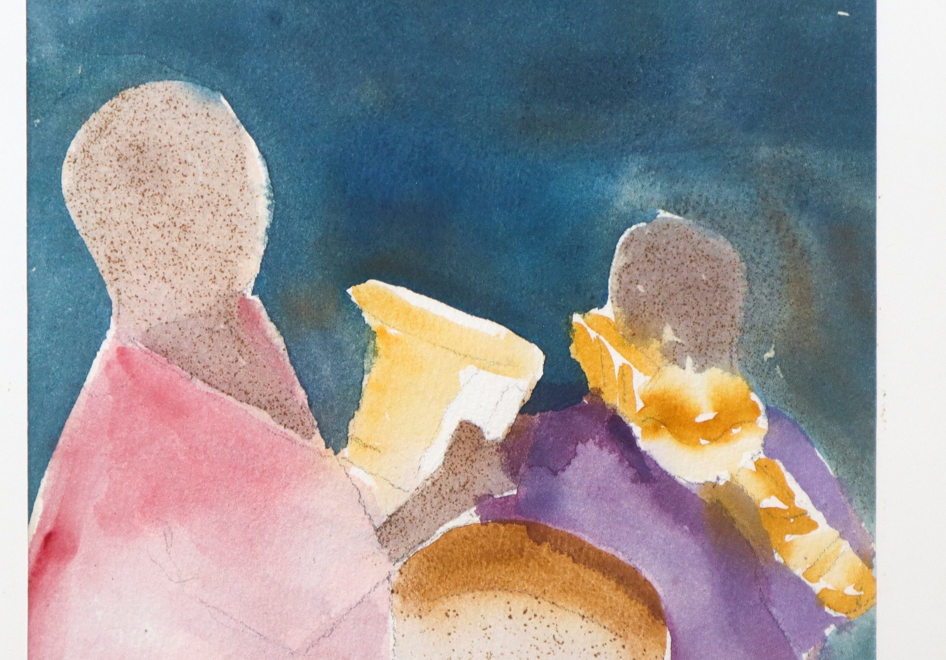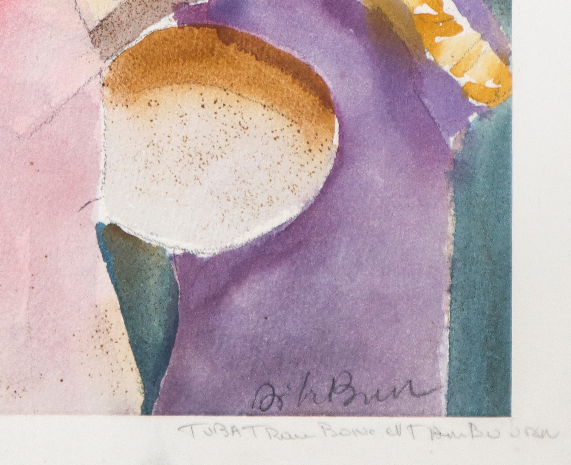 Coppia di figure con trombone cm 30 x 24, in cornice 65 x 50 Acquerello su cartoncino Firmato in basso a destra.
