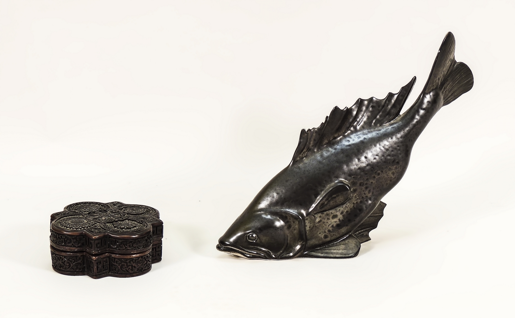 LOTTO DI OGGETTI IN CERAMICA DIPINTA A FINTO BRONZO - FAUX BRONZE PAINTED CERAMICS un gruppo a forma di pesce ed una scatola orientale, difetti