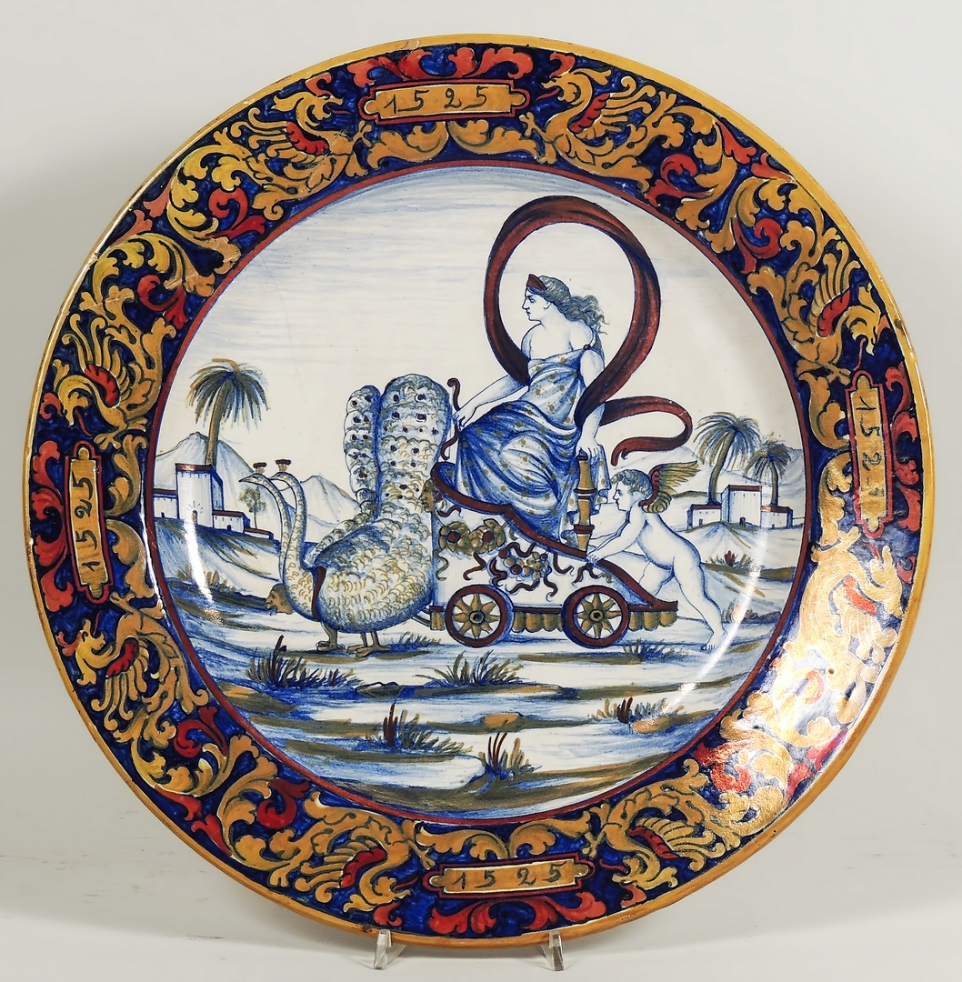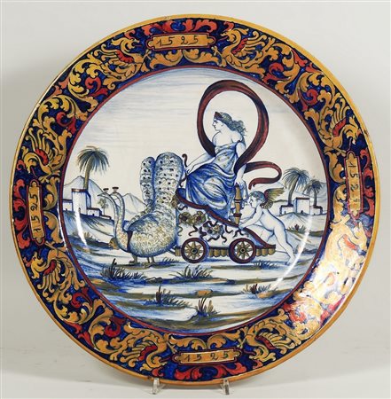PIATTO DA PARATA IN MAIOLICA POLICROMA - PAINTED MAJOLICA PLATE inizio del XX secolo - early 20th Century dipinto in stile neorinascimentale con al centro il carro di Giunone, difetti diam cm 43,5