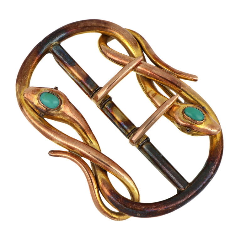 Fibbia in oro giallo raffigurante due serpenti che si incrociano teste in turchesi.