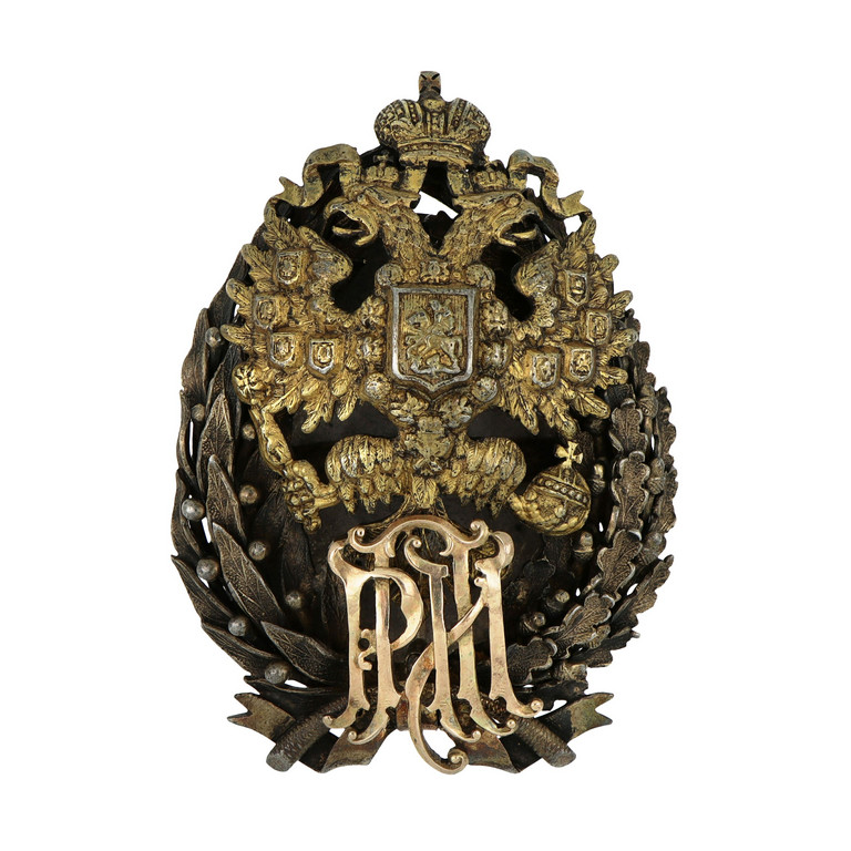 Stemma imperiale russo in argento e oro con monogramma in oro rosa punzoni del titolo alla maniera russa e testa di Minerva.