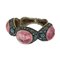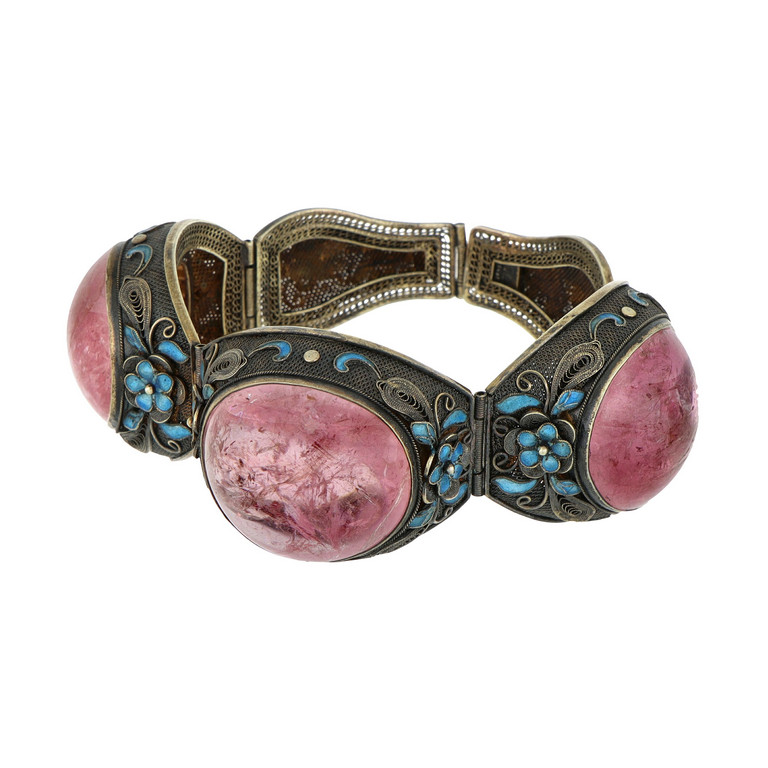 Bracciale a 'Boule' 3 grandi tormaline taglio cabochon montate in argento e oro basso titolo decori floreali e smalti azzurri.