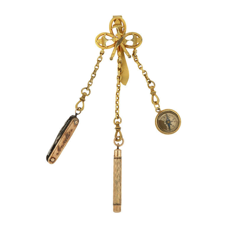 'Kit da esploratore' fermaglio alla cintura in metallo dorato coltellino con guancette in oro rosso bussola matita retrattile.