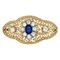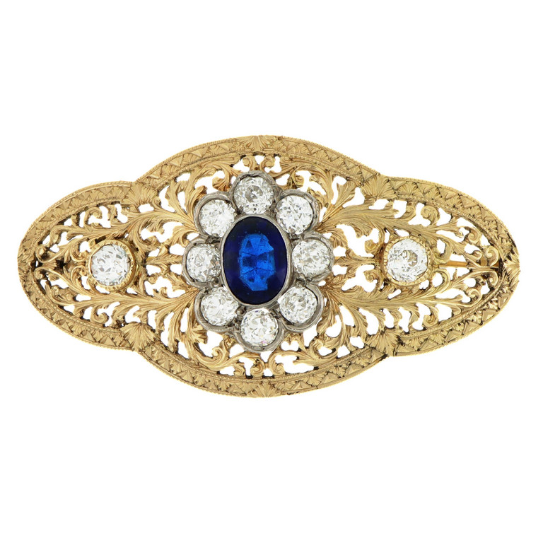 Spilla in oro rosa e bianco di forma lobata e traforata con 10 diamanti taglio antico per stimati ct 1 0 e zaffiro sintetico al centro.