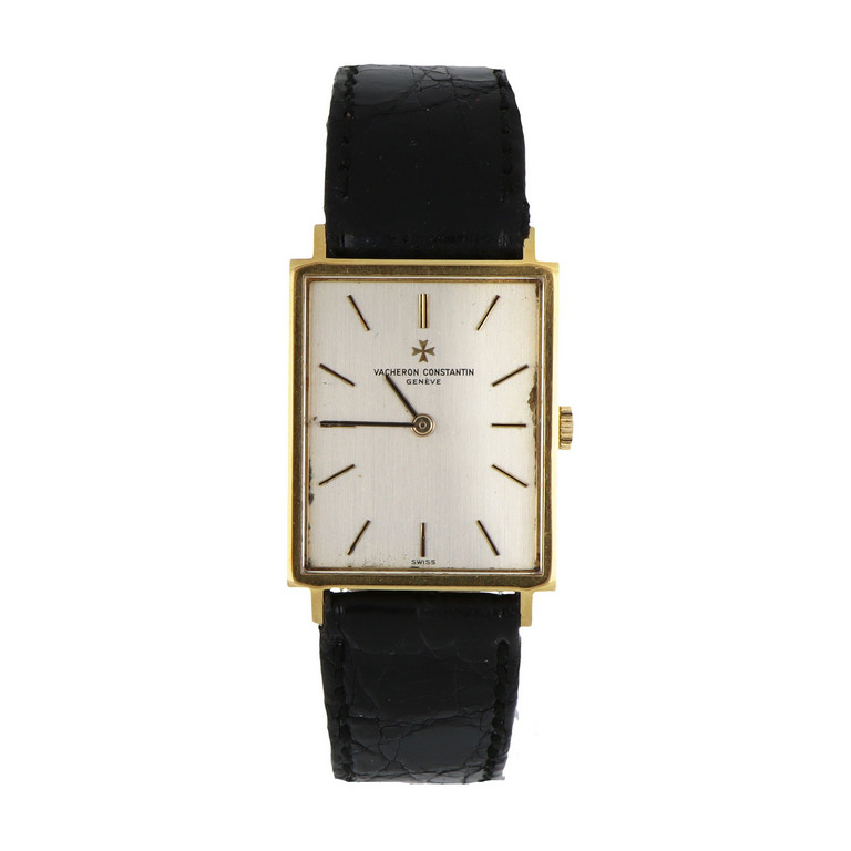 Vacheron e Constantin fine orologio da uomo in oro giallo di forma rettangolare ultrapiatto meccanico a carica manuale indici e lancette a bastone quadrante argente'.