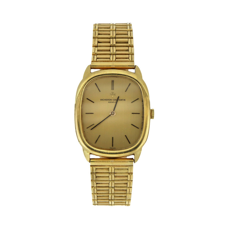 Vacheron e Constantin elegante orologio da uomo in oro giallo con bracciale non originale modello ellittico quadrante champagne con indici a barretta e sfere a bastone movimento di manifattura a carica manuale punzone di Ginevra.