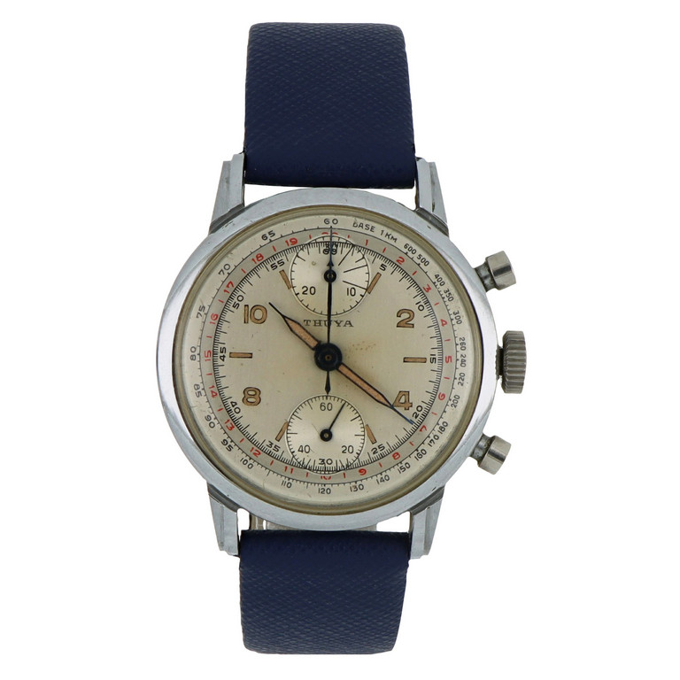 Thuya orologio da uomo in acciaio con funzione cronografica tasti a pompa e fondello a vite quadrante argentato satinato con scala tachimetrica rossa alla periferia.